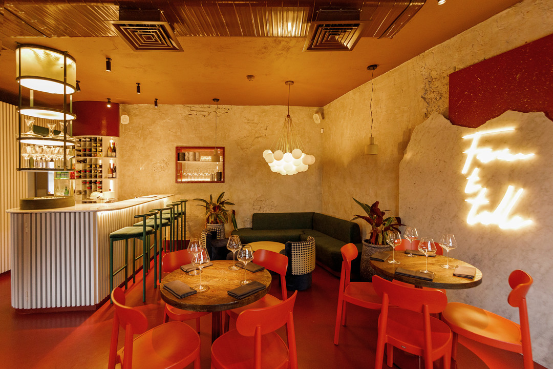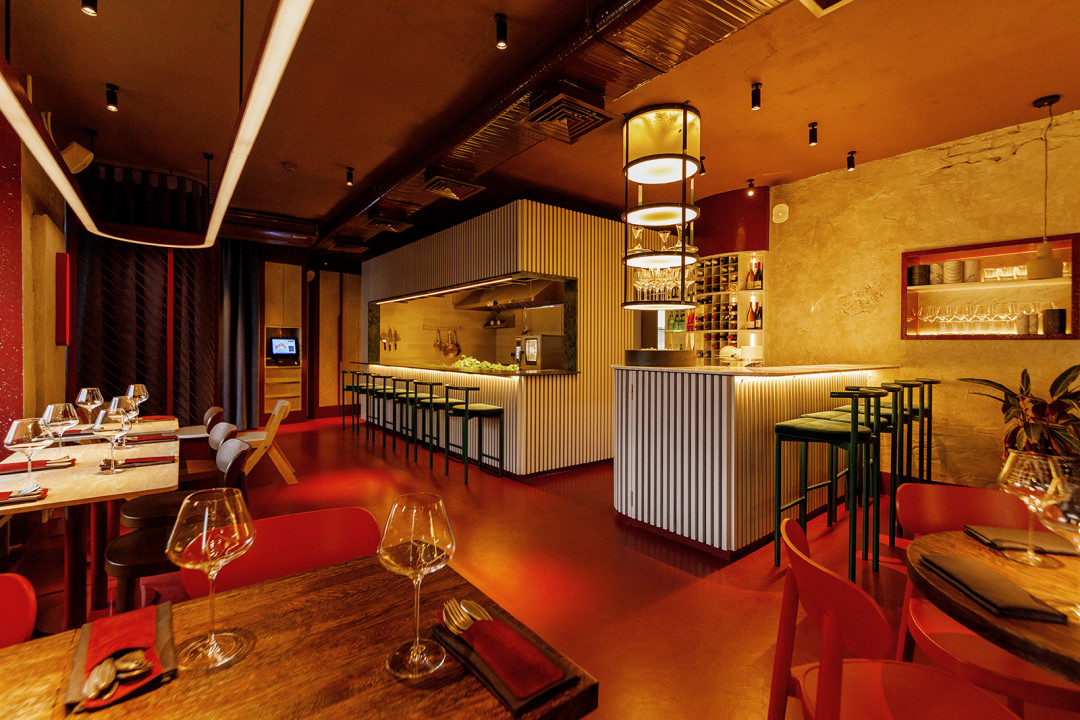 Оформлением интерьера занималась Юнна Лукинских (Yuloo Studio). Для компактного помещения, рассчитанного на 40 посадочных мест, она выбрала насыщенные глубокие тона и приглушенное освещение, располагающее к долгим разговорам за бокалом вина. Барную стойку и открытую кухню, которая встречает гостей у входа, отделали светло-серыми панелями и натуральным зеленым мрамором, пол и оконные проемы – микробетоном в оттенках бордового, а центральную стену покрыли фактурной штукатуркой и украсили инсталляцией из большого куска светлого мрамора. Уют в этом довольно брутальном пространстве создает минималистичная дизайнерская мебель в духе 60-х, большая модернистская люстра в одной из зон, серая портьера, отделяющая входную зону, и живая зелень.