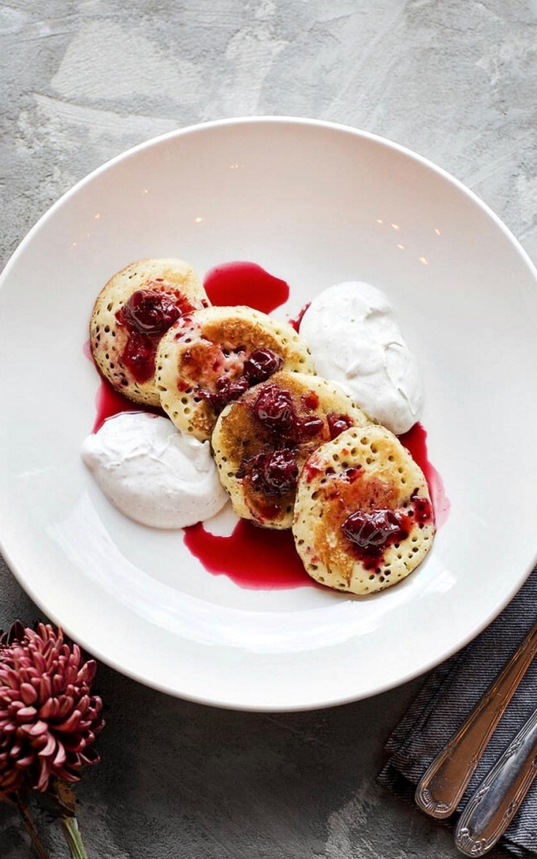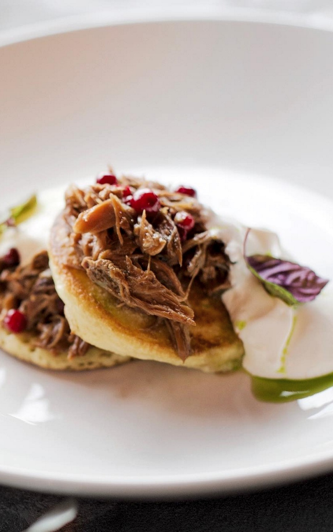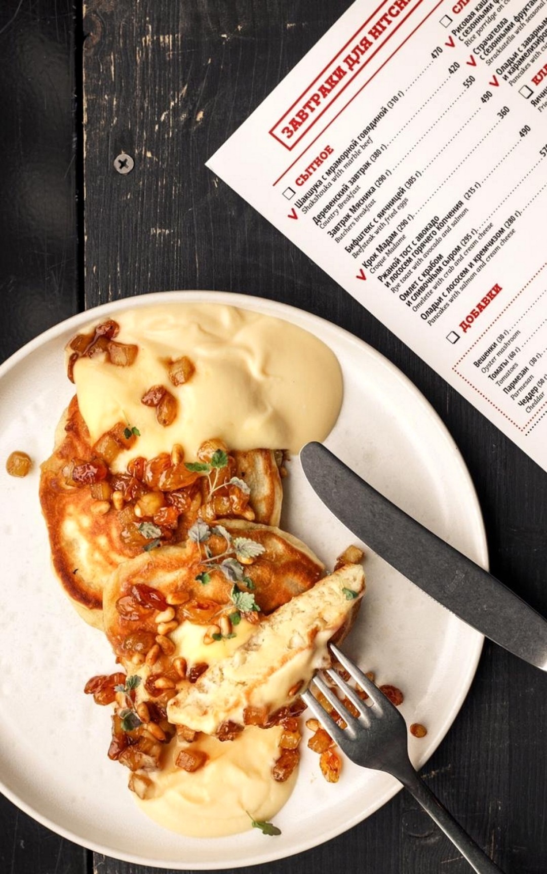 Завтраки, спродюсированные хозяйкой Людмилой Ивановой и шеф-поваром Виктором Гусевым, здесь легендарны — хотя бы потому, что начинаются для Петербурга рано, в 8 утра, даже в воскресенье. Сырники — хэдлайнеры утренних трапез: теперь их делают только из рикотты. Топпинги — карамель и брусничный соус. Недавно появился новый, более сытный вариант – с лососем и голландским соусом с артишоками. И – всеми руками! – голосуем за оладьи с томленой фермерской уткой, сметаной и моченой брусникой.