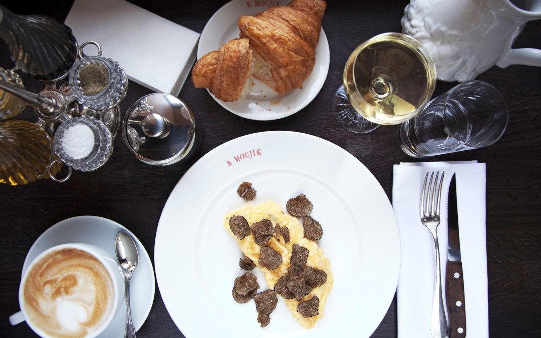 В новом русско-французском бистро Эдуарда Мурадяна и Натальи Плехановой с открыточным видом на Фонтанку сервируют завтраки с восьми утра. В ресторане во французском стиле с вкраплениями русскости в виде глиняных плошек для каш предлагают свежеиспеченные багеты, круассаны и крок-месье (жаль, не собственного производства) и четыре сета с завтраками: несколько простых — с овсянкой, гранолой, яйцами бенедикт и один великосветский — омлет с черным трюфелем и икрой (разумеется, черной) под бокал игристого гран крю.
