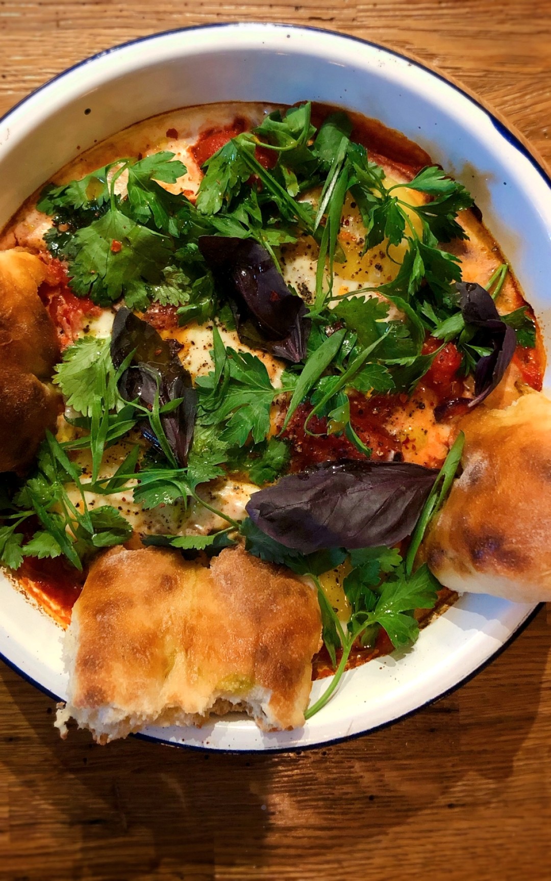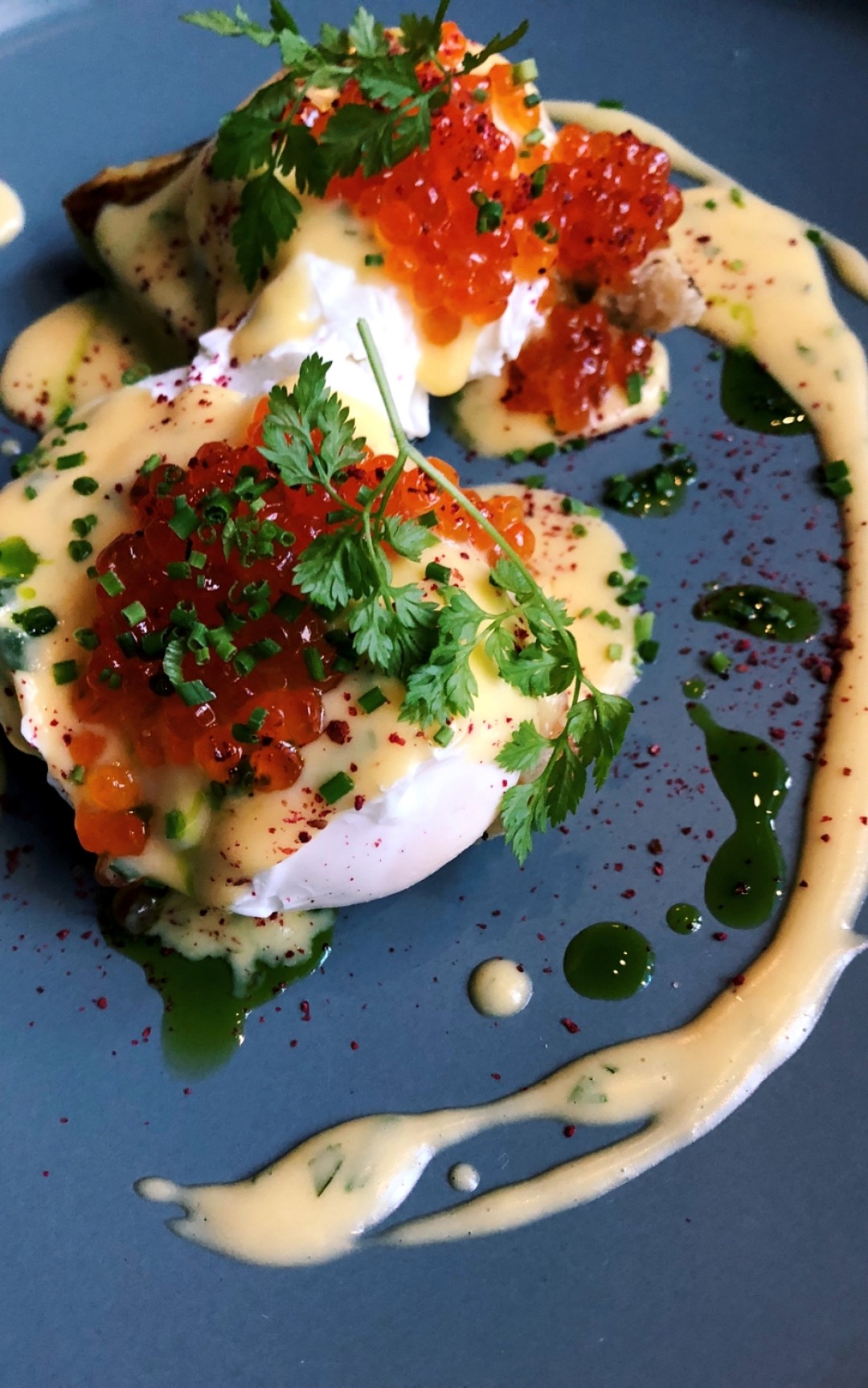 В любимое бистро с еврейской-арабо-марокканскими акцентами мы регулярно ходим на запеканку из рикотты с хурмой и заварным кремом и начиненные воздухом круассаны, в особенности на те, что с рикоттой и сезонными ягодами, – их заказывают у Pastry Bitches. А с декабря в меню новое мультинациональное блюдо – яйца бенедикт в соусе голландез, выложенные на обжаренную питу и щедро усыпанные красной икрой.