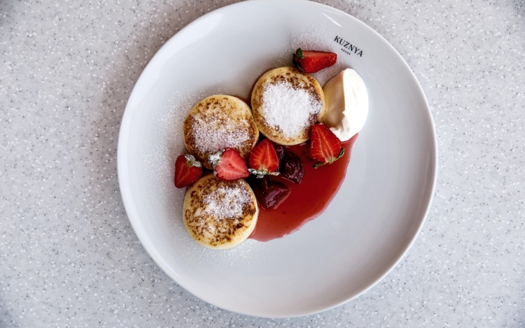 Недалеко от Казанского собора завтраки сервируют с 8 утра: лосось слабой соли вместе со слайсами авокадо и яйцом пашот укладывают на тосты из бородинского хлеба и посыпают листьями рукколы и шпината, а к сырникам выносят на выбор варенье из малины, клубники, черники и клюквы.