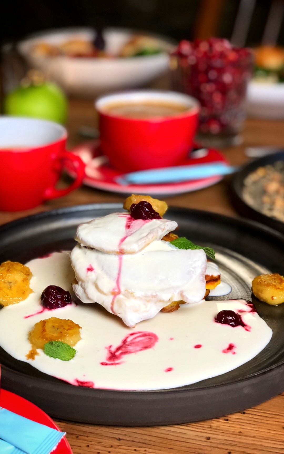 Завтраки появились и на острове Новая Голландия, правда, поздние, только с полудня. Здесь уловили любовь горожан (и нашу!) к сырникам и тостам с авокадо – и вот, пожалуйста, предлагают сырники с клубникой и сметаной и ржаной тост с авокадо и яйцом пашот. В фаворитах у нас оладьи из творога с клюквой и кленовым сиропом.