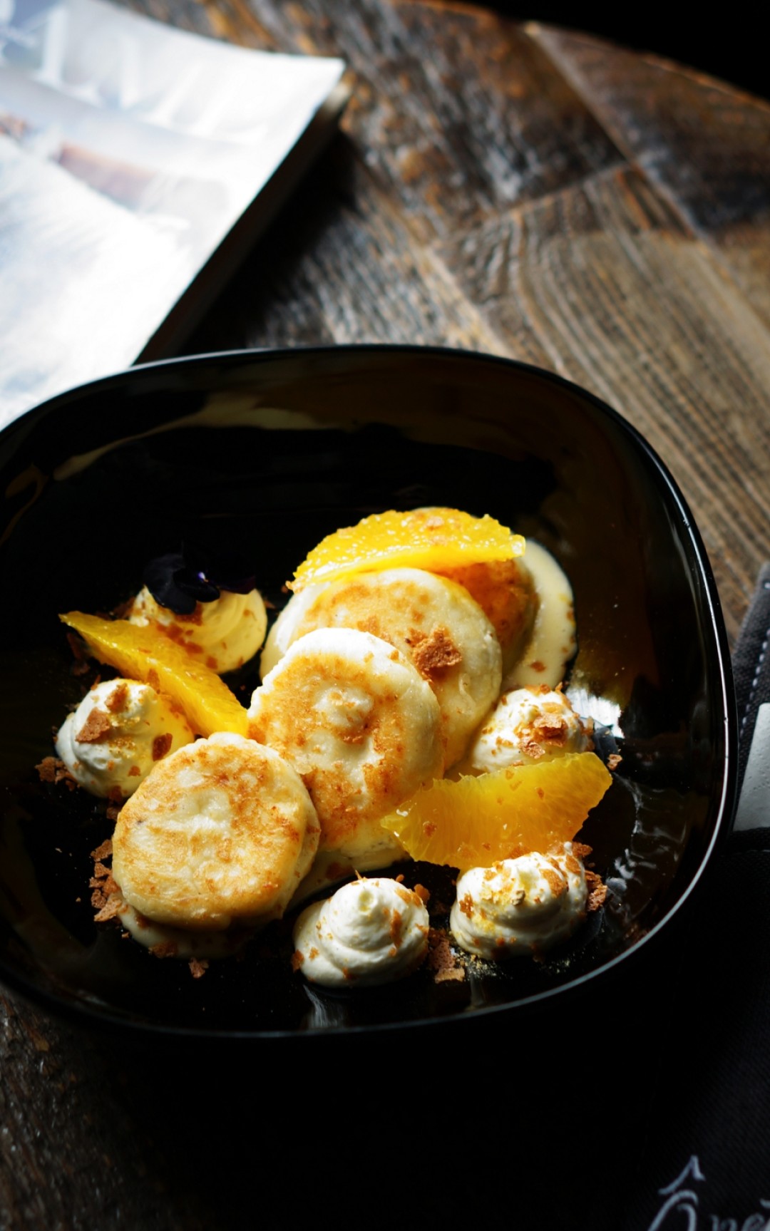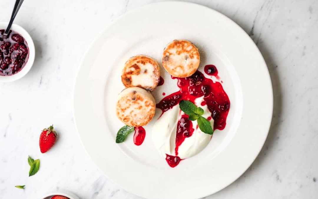 Заглавное блюдо Людмила Жалнина делает в разных транскрипциях: по классическому рецепту с щепоткой манки, из рикотты с муссом из халвы и взрывающейся карамелью, на кокосовой муке, но самыми популярными остаются сырники из творога на топленом молоке, гармонично сочетающемся с кремом из кураги. Из других наших любимых позиций – ржаной тост с козьим французским сыром шефр с гуакамоле и вялеными томатами.