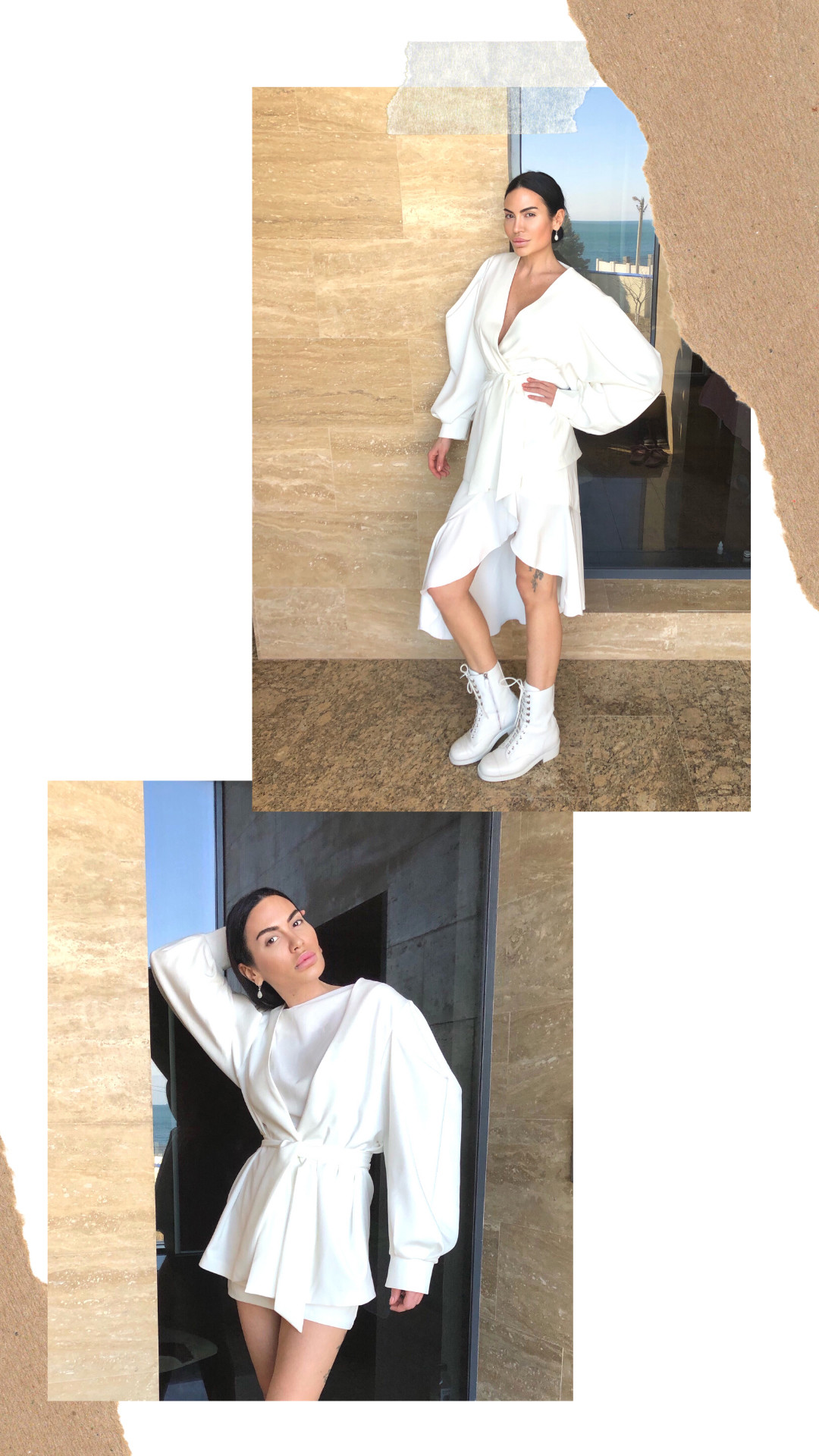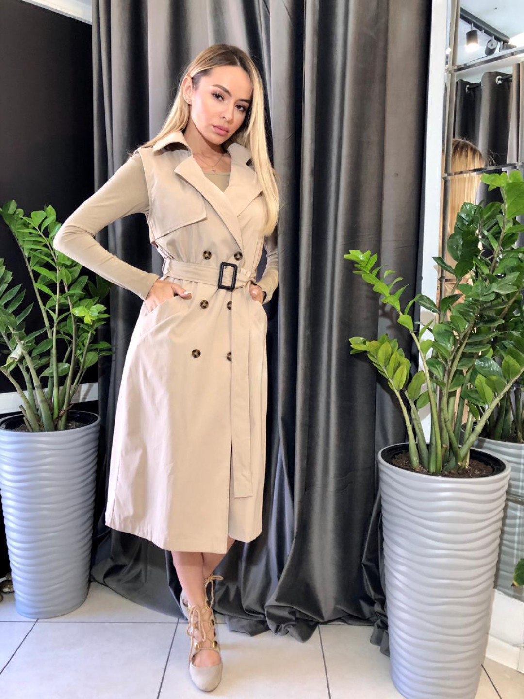 - Тренч-платье и комплект: трикотажное боди и джинсы от Студии итальянской одежды Diversa.
