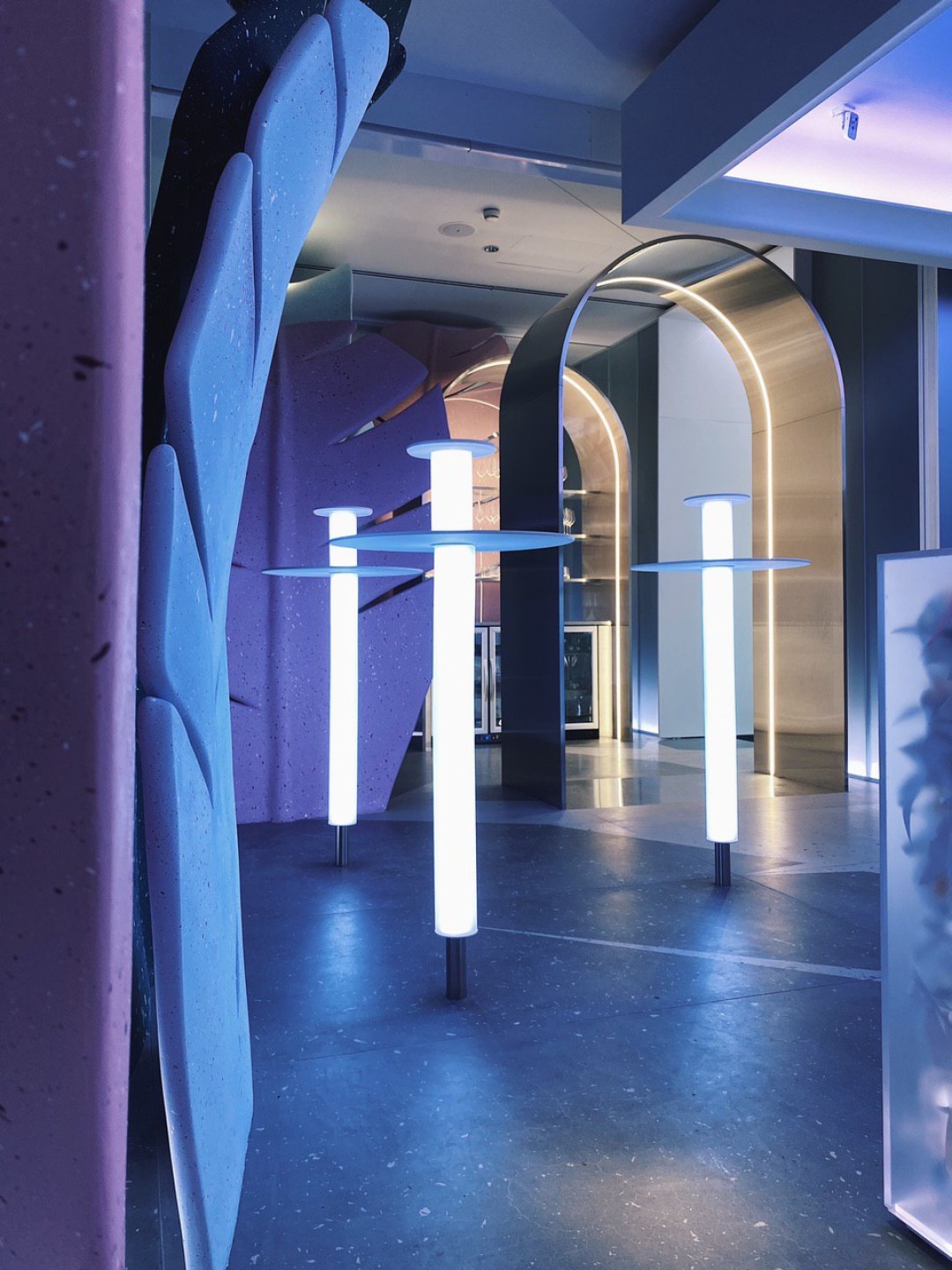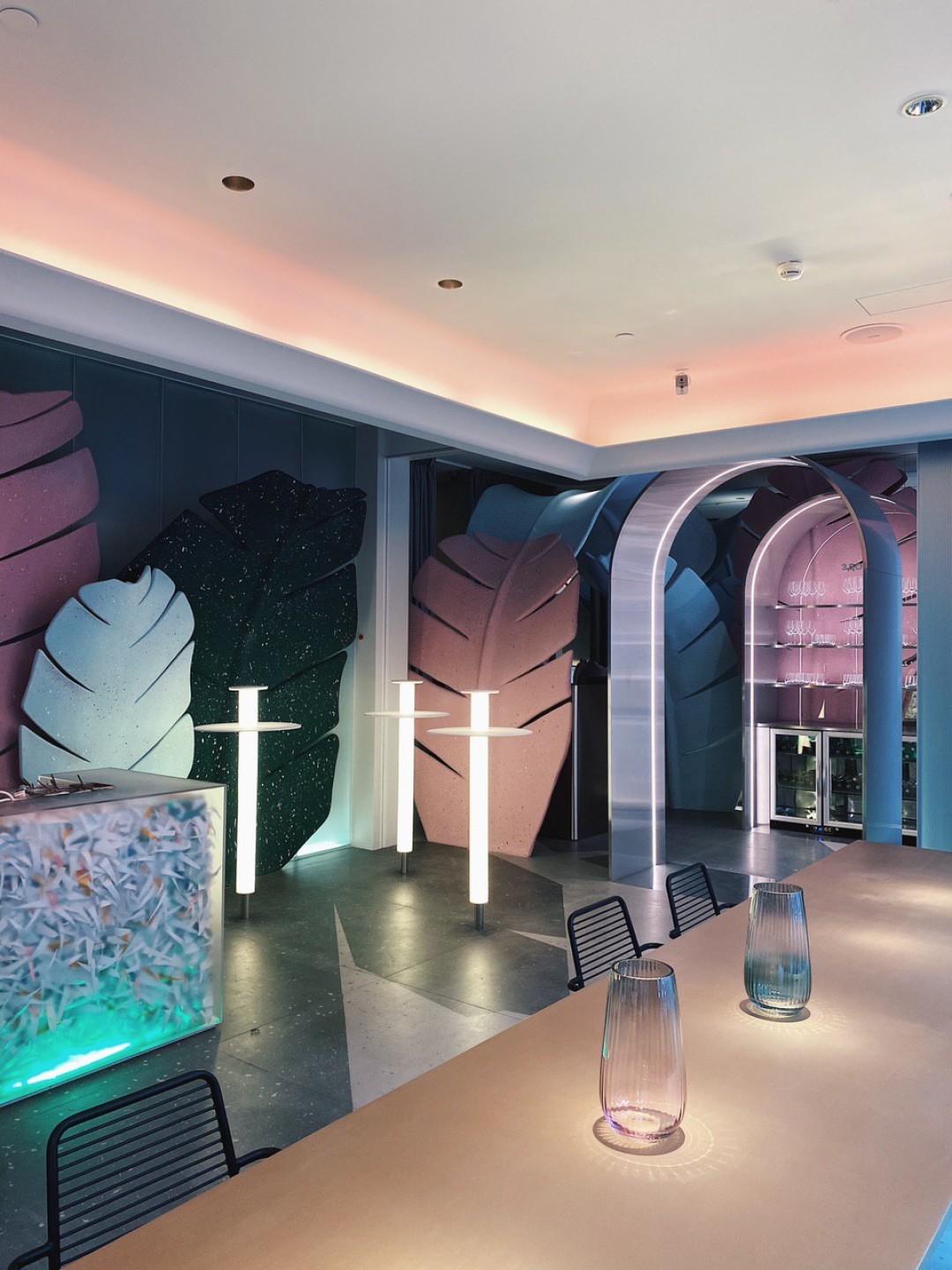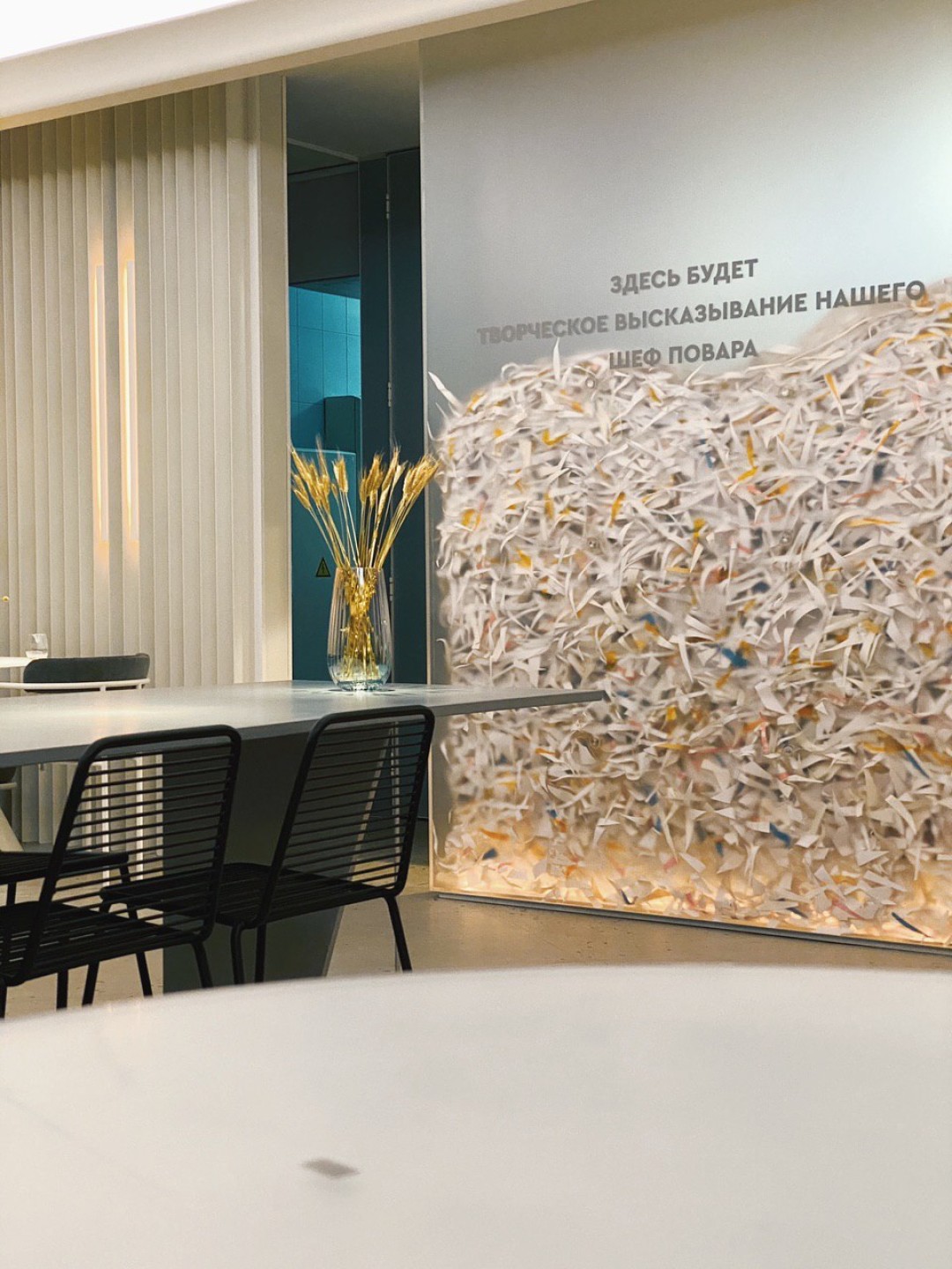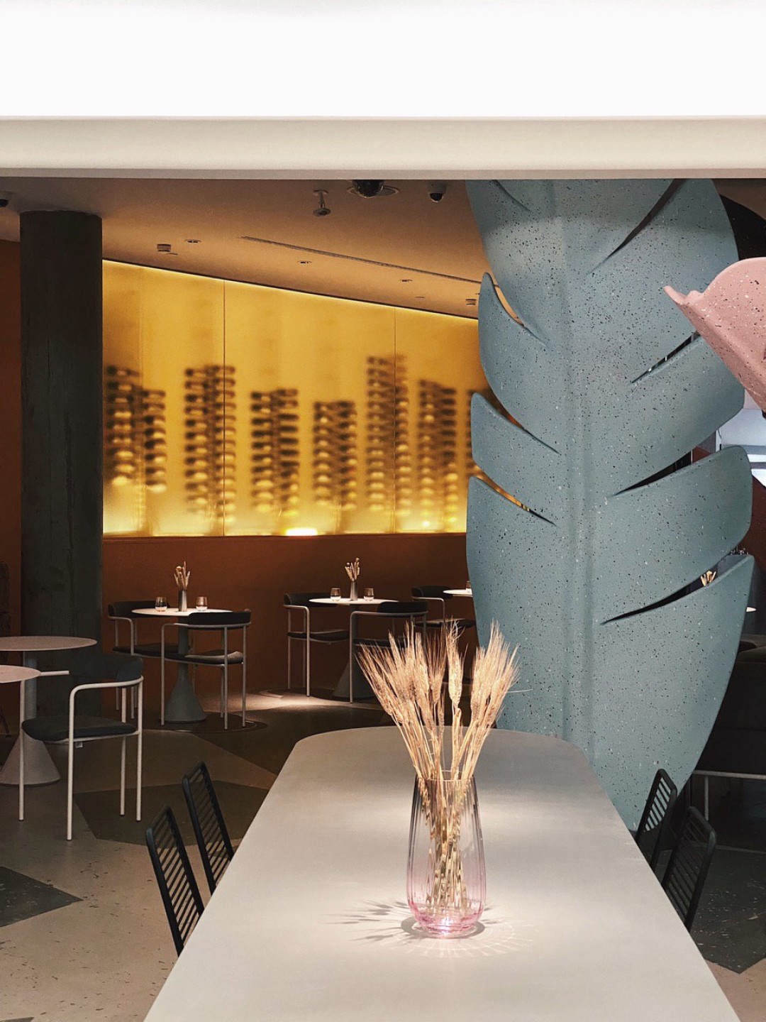 Интерьер делали бюро DA bureau. Дерзко. Женственно. Неочевидно. Вы будто нашли себя в декорациях к бертоновской «Алисе в стране чудес» —или в одном из залов галереи Тейт. Станции официантов из цельных кусков тополя, как и высокие барные стулья — отсыл к русским скрепам. Гигантские «листья» из переработанного стеклопластика делали декораторы Мариинского театра. Маленький Чебурашка и Дюймовочка с сотней солдатиков, интегрированные в столешницы,  — про детство и про маму. Свет заигрывает и может менять свое настроение от теплого релакса до кислотного рейва — это про витальность. Вопросы к обстановке есть, но плоха та вещь, которая не вызывает никаких эмоций, верно?