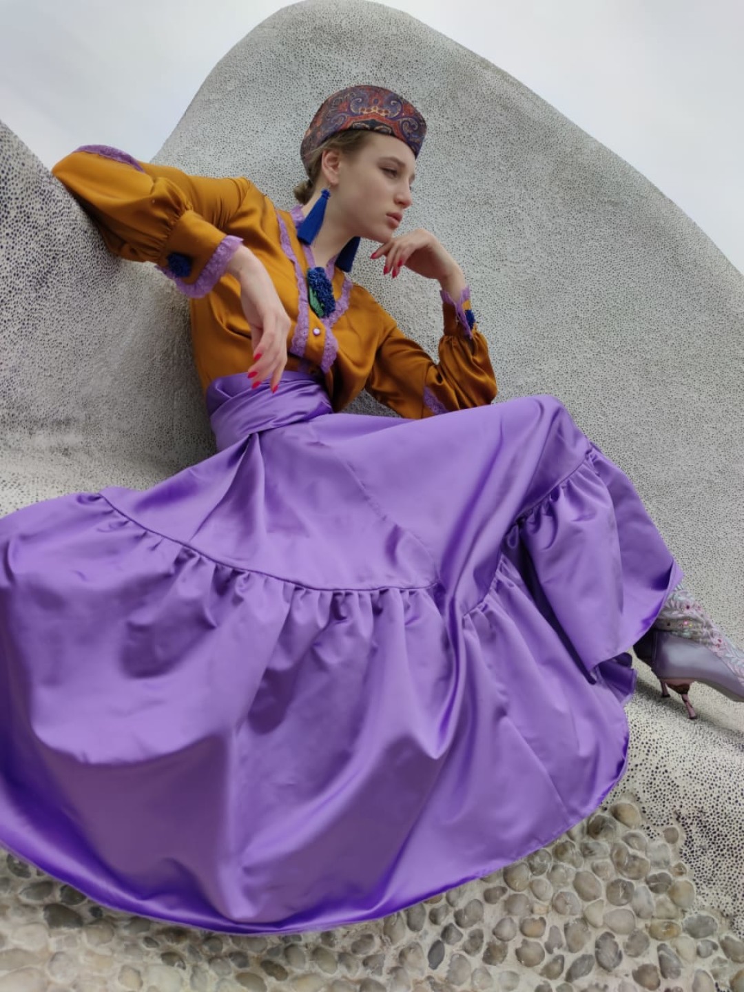 Происходящие в стране события, пандемия и царящая атмосфера тревожности и нестабильности напомнили мне военное время, что вдохновило на такие детали как защитная маска и головной убор в виде дизайнерской пилотки. Костюм должен быть многофункциональным - в эпоху осознанного потребления это необходимое условие.