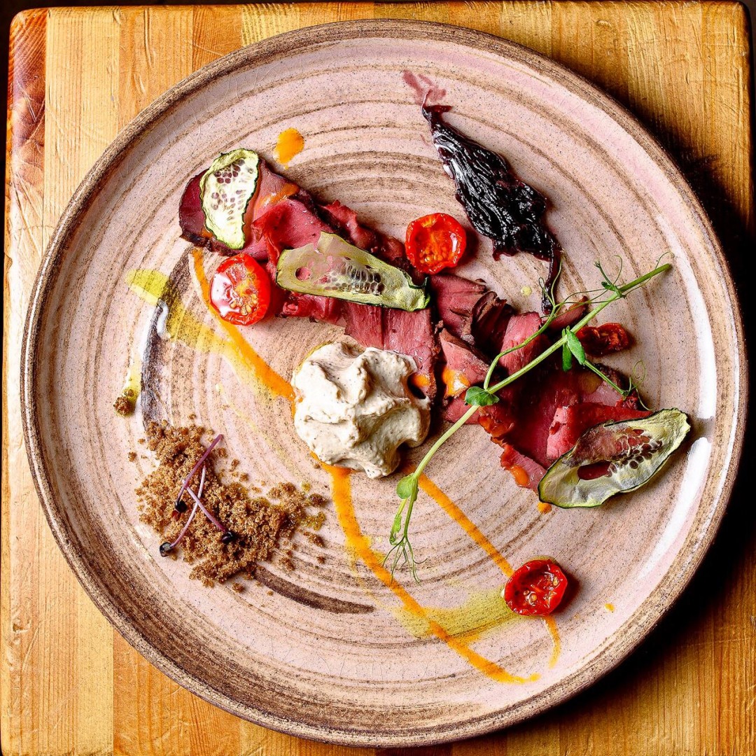 Карпаччо из подкопченного телячьего сердца с муссом из белых грибов, мармелада из ялтинского лука, гелем из томатов и землёй из бородинского хлеба.