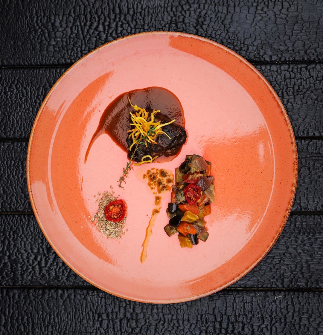 Томленая говяжья щека в пивном Деми глас с овощным гарниром, вяленным томатом и землёй из миндаля.