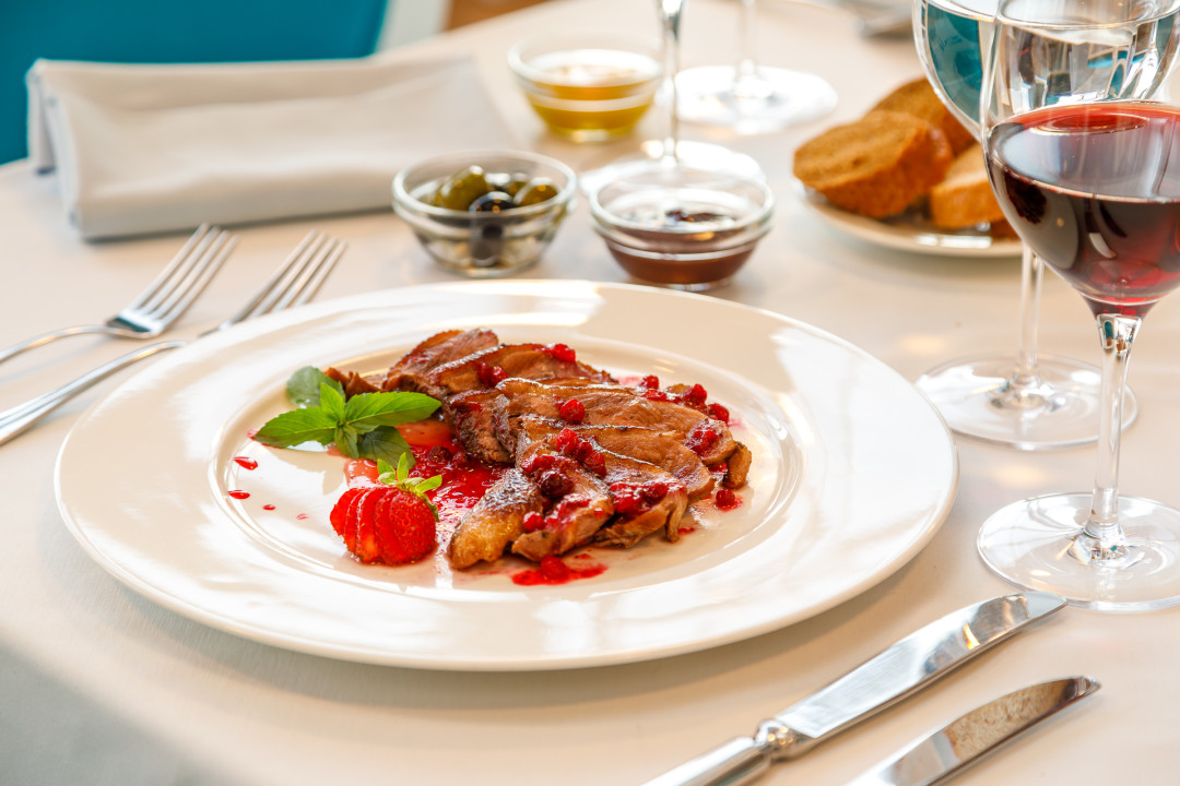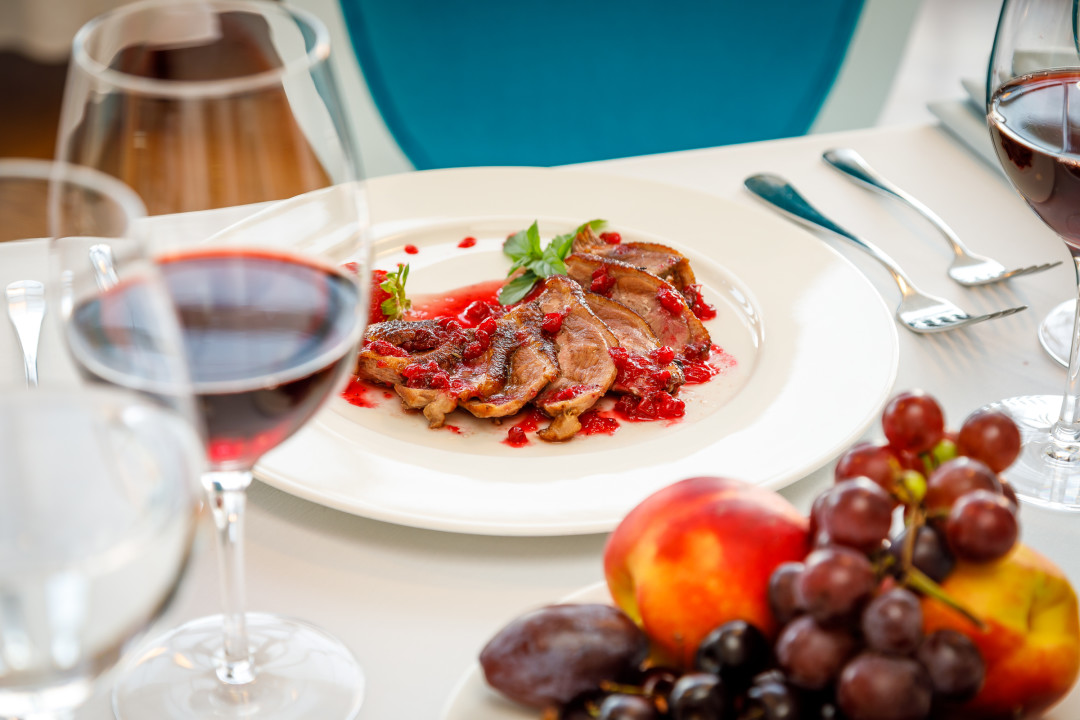 Филе копчёной утки с пряной грушей и соусом из ягод.