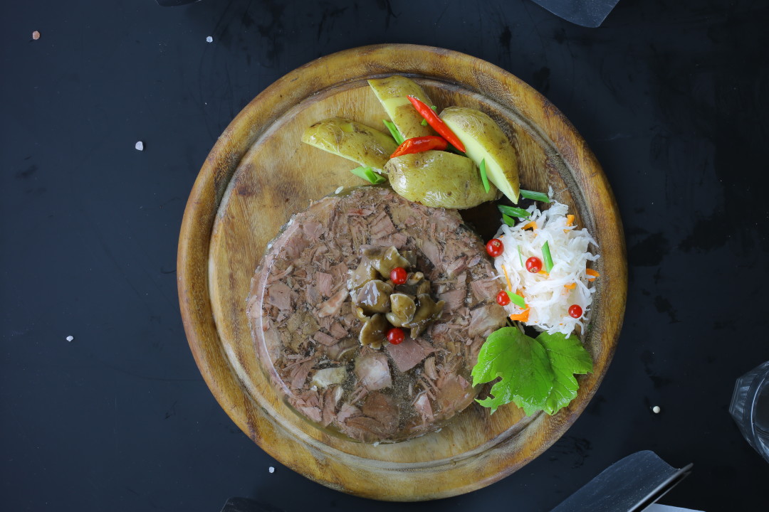 Холодец из фермерский говядины подаётся с хреном и горчицей.