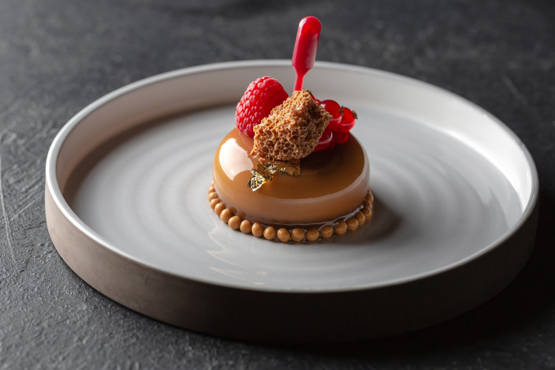 Десерт «Мандарин» - мандариновый мармелад с можжевеловой ягодой, сегментом из мандаринов и гелем на основе свежевыжатого сока мандарина, мандариновый наппаж и белый шоколад.