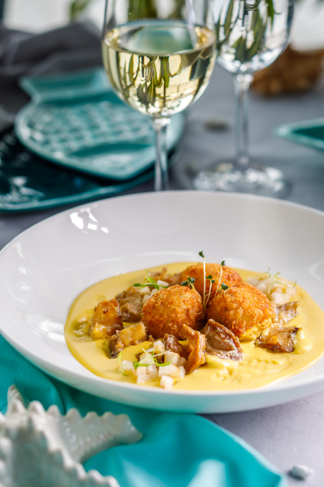 крымского рапана на креме из кукурузы с крокетами из сыра и зелени, чатни из груши.