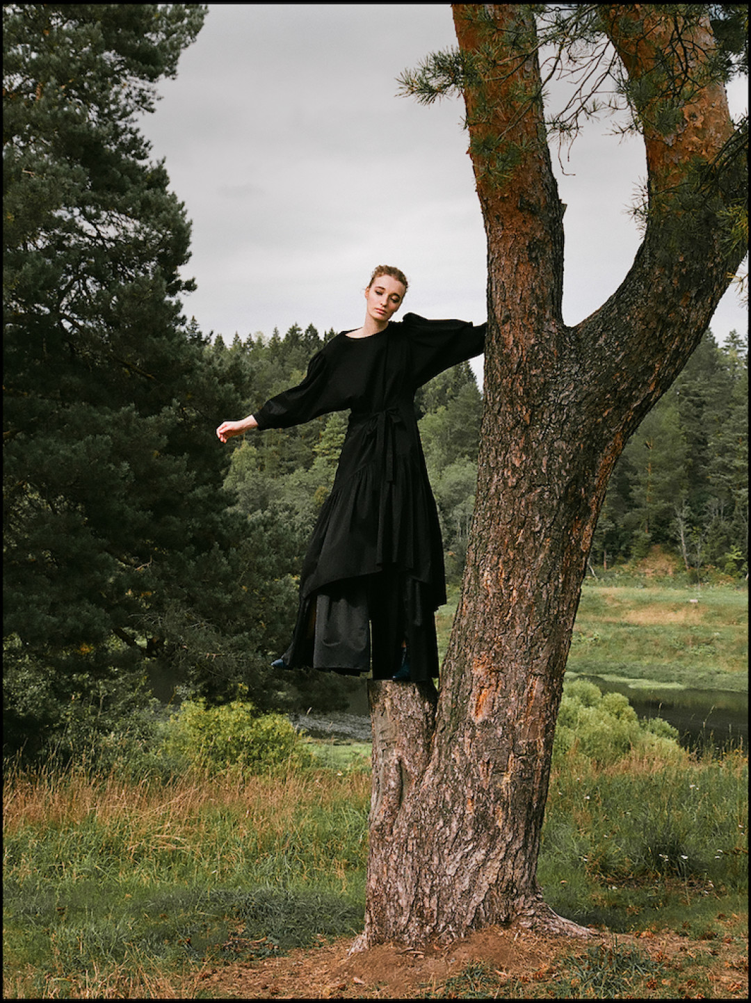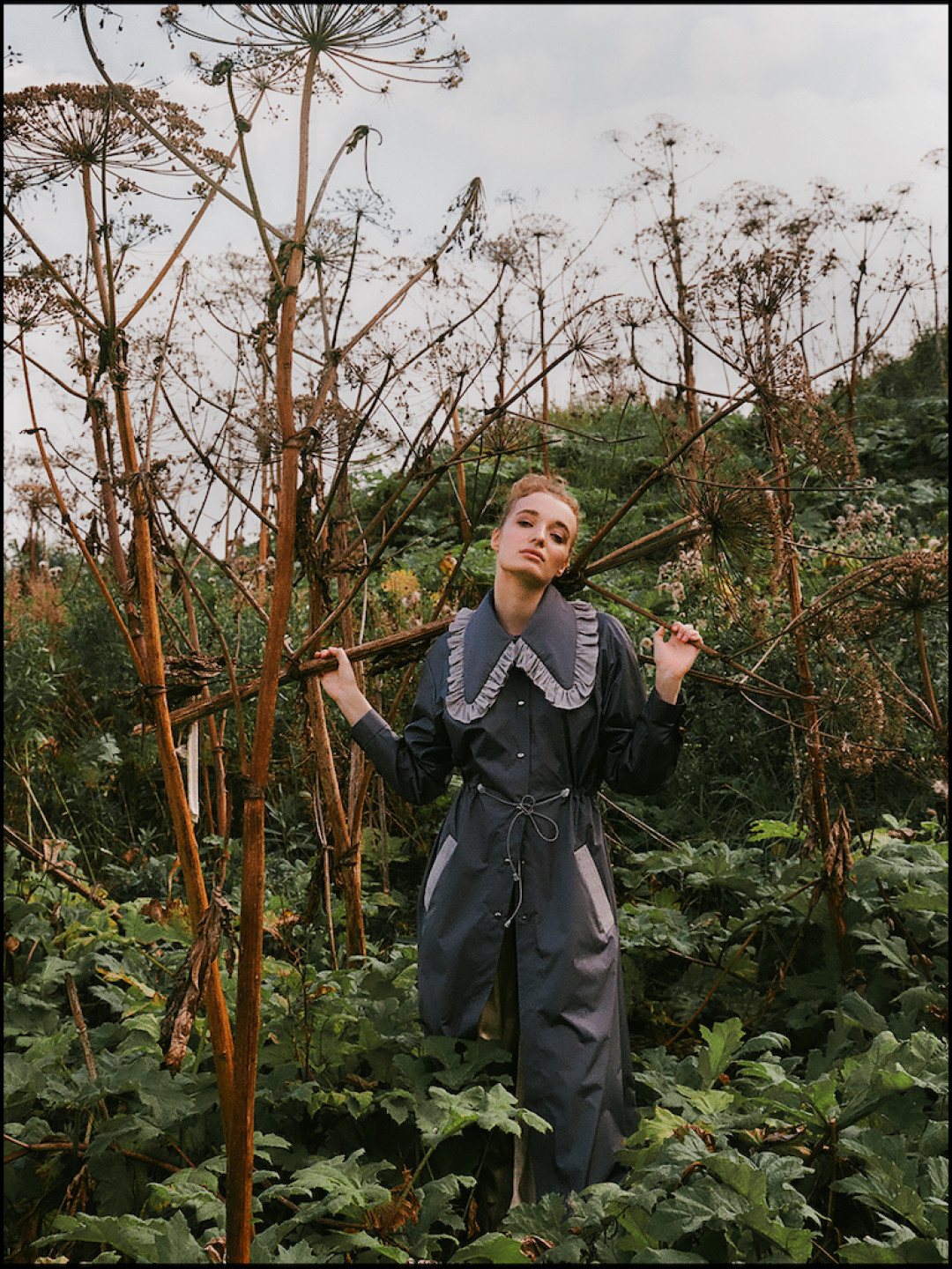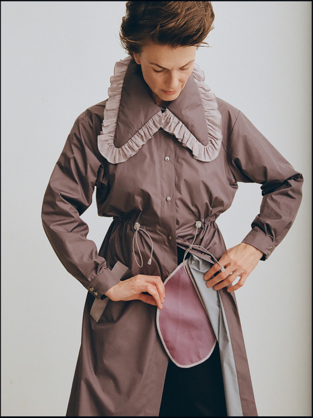 Осенняя коллекция, окрашенная в серо-лиловый, фиалковый, лавандовый и цикламеновый оттенки, подчеркивает связь человека, моды и природы. Все вещи в ней выполнены из органических материалов и стоят от 8500 (за плиссированную манишку) до 25 000 (за тренч с косынкой) рублей. Коллекция поступит в продажу в лимитированном количестве (что также отражает ее эко-концепцию) на официальном сайте бренда в начале октября.