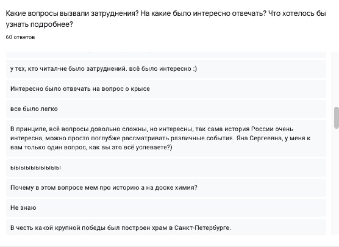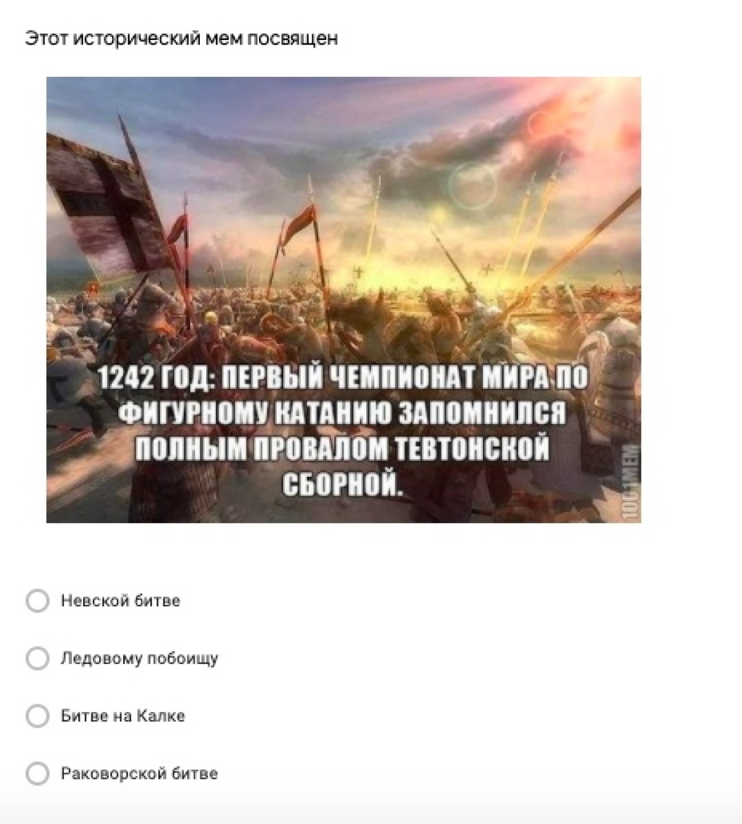 Я не работаю на предложенных платформах, большинство из них все равно зависают, поэтому просто сделала свой сайт на платформе гугл и выкладываю материалы туда. Тесты стараюсь составлять так, чтобы над ними нужно было, действительно, подумать (на умения), в них то, что разбиралось в презентации или видеоуроке. Например, даю какой-нибудь исторический мем: на картинке Екатерина II говорит, что присоединила Крым, ученикам надо написать в каком году это произошло. Или дается марка, на ней изображен исторический деятель — надо определить какому событию она посвящена. Создание таких тестов занимает много времени, очень много. Кстати, можете сами попробовать пройти мой тест для 8 класса)