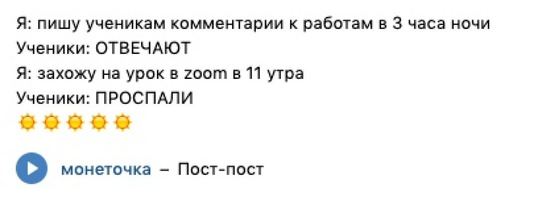У меня был урок в 11 утра в zoom и половина класса написала мне, мол, простите, мы проспали. Потому что они не спят до четырех часов ночи, ночью присылают мне комментарии по работам. Спрашиваю: почему не спишь? Ответ: потому что у меня сбит режим. Честные ученики сами признают, что прокрастинируют, они не могут собраться и доделать задание. Ответственные дети присылают задания даже раньше дедлайна.
