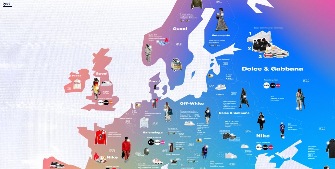 Сервис персональных рекомендаций по шоппингу Lyst, который теперь имеет платформу в России, подготовил интерактивную карту модных тенденций Европы. Для этого специалисты проанализировали шоппинг-привычки и поведение интернет-покупателей в России и других странах, которые ищут, просматривают и приобретают модные товары у более чем 12 000 брендов и онлайн-магазинов.