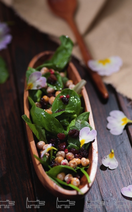 В глубокой миске соедините зелень, изюм и нут. Полейте оливковым маслом и уксусом по вкусу, приправьте солью и осторожно всё перемешайте.