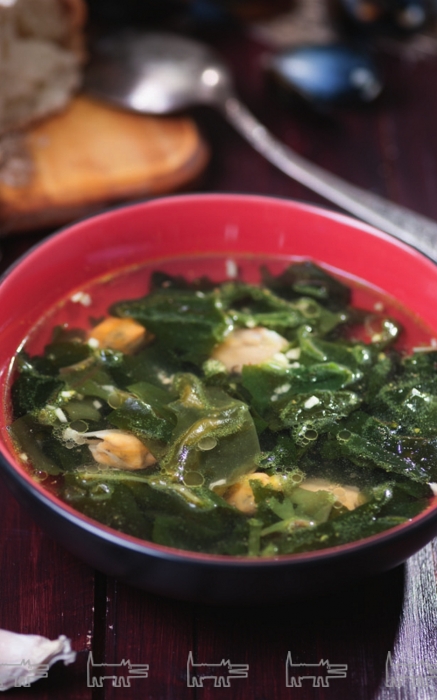 В глубокую миску налейте теплую воду и опустите в нее сушеные водоросли. Через 5 минут слейте с них воду и снова залейте. Дайте постоять еще 5 минут, затем слейте воду. Нарежьте водоросли на небольшие кусочки. В кастрюлю выложите ракушки, масло и рубленый чеснок и залейте водой, чтобы она закрывала моллюски. Доведите до кипения. Выньте ракушки из бульона, когда у них раскроются створки. Если часть моллюсков не раскроется после 5 минут кипения, выбросьте их. Пока ракушки остывают, процедите бульон через мелкое сито и снова поставьте на огонь. Добавьте измельченные водоросли и доведите бульон до кипения. Разломив створки моллюсков, выньте из них мясо. Снимите бульон с огня, добавьте мясо моллюсков, поперчите и подавайте.