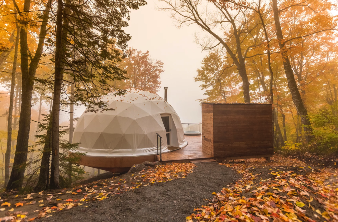 Отель Domes Charlevoix – это три огромных шатра в туристической базе в коммуне Петит-Ривьер-Сен-Франсуа. За этой идеей стоят архитекторы квебекского бюро Bourgeois/Lechasseur Architectes. В каждом номере есть все необходимое: огромная кровать, кухня, гостиная и ванная комната с итальянским душем. На террасах расположились джакузи с шезлонгами, а бетонные полы в шатре оснащены подогревом. Вид на реку Святого Лаврентия, горный массив и кроны деревьев, а также окружающая тишина – вполне себе неплохие бонусы к идеальным для проживания условиям.