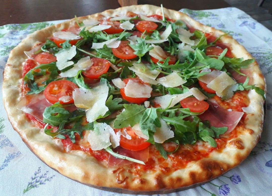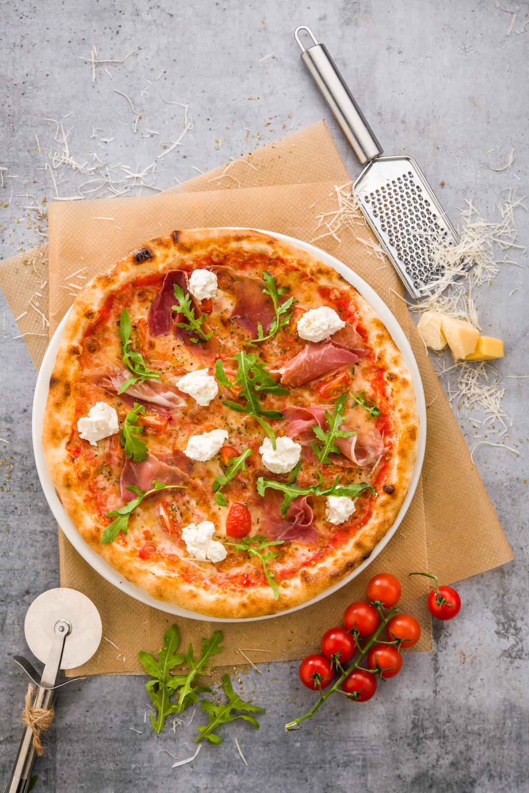 В итальянской пиццерии свой хит готовят с сыровяленой ветчиной, рукколой, помидорками черри и сыром «Грана Падано».