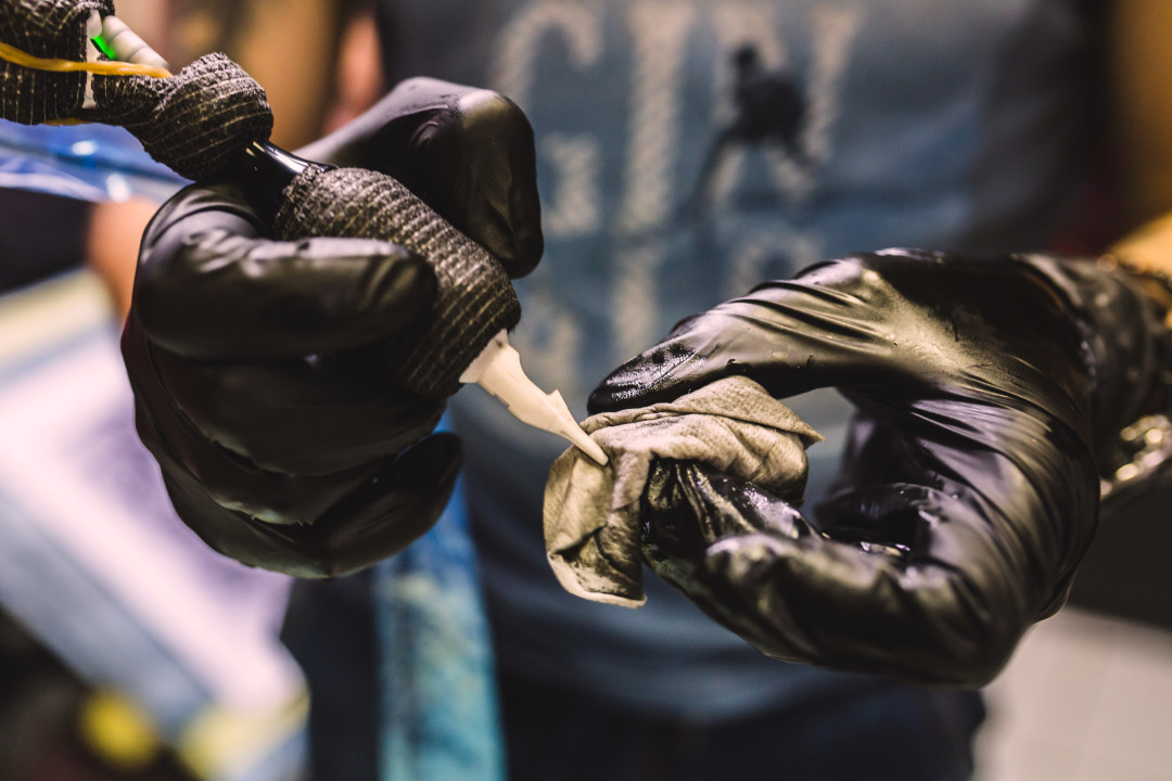 Чтобы уменьшить болевые ощущения, можно использовать обезбаливающую мазь или спрей для тату. Я за использование таких средств, если в них есть необходимость: когда человеку не так больно, он дышит ровнее, не дергается и не ерзает – и мне проще сделать работу с ровными линиями. Да и клиенту не так неприятно из-за болевых ощущений. За пять лет работы у меня было не больше двадцати клиентов, которым был реально необходим анестетик перед татуировкой: преимущественно люди говорят, что все оказалось не такими болезненно, как они думали.