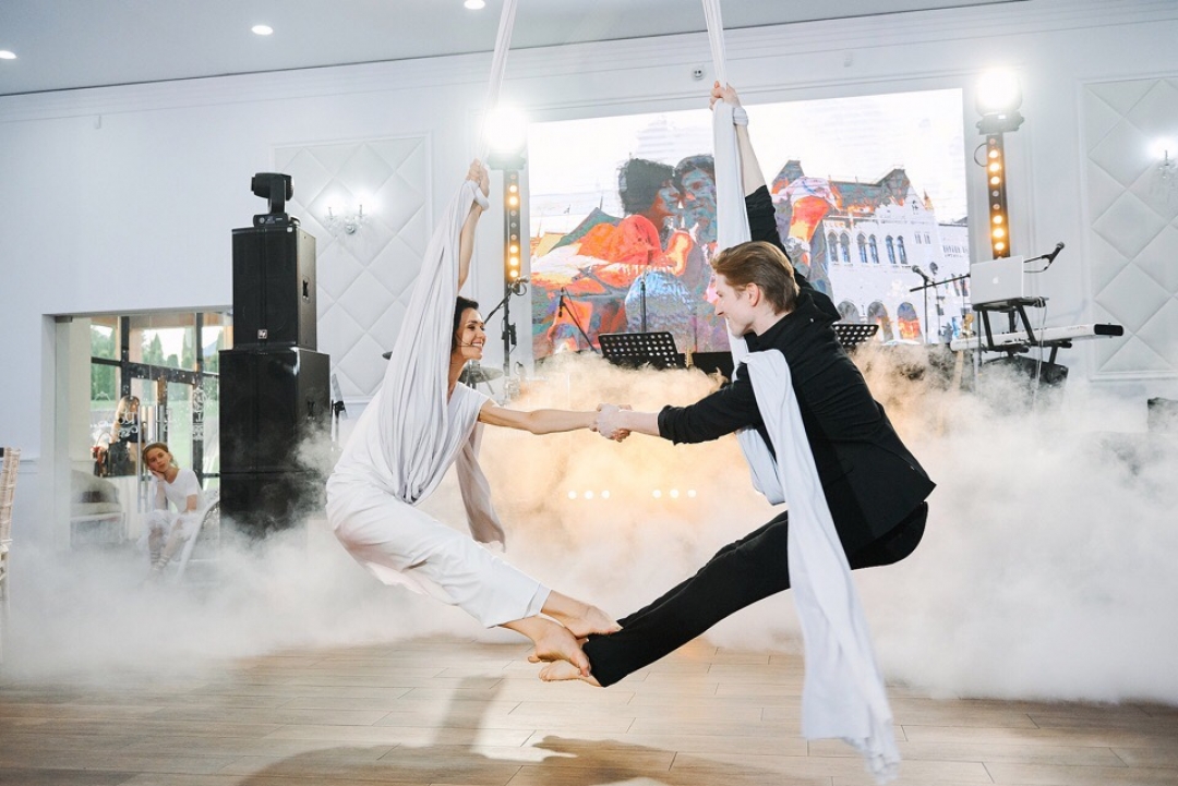 Мы с Денисом — артисты балета, поэтому, естественно, от нас ждали роскошного первого танца. Но в этот раз нам хотелось танцевать, в первую очередь, для себя, придумать что-то действительно оригинальное. Когда мы приехали в усадьбу обговаривать организационные моменты, нам сказали, что в зале есть крюк для полотен. Я зацепилась за эту идею (в прямом смысле слова!), долго и сложно уговаривала жениха, а когда он, наконец, согласился, наняла профессионального тренера. За четыре занятия он раскрыл нам секреты танцев с полотнами и обучил необходимым (очень красивым!) элементам. Хотя без стресса перед выступлением, конечно, не обошлось.