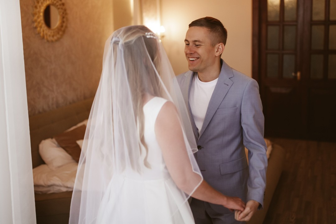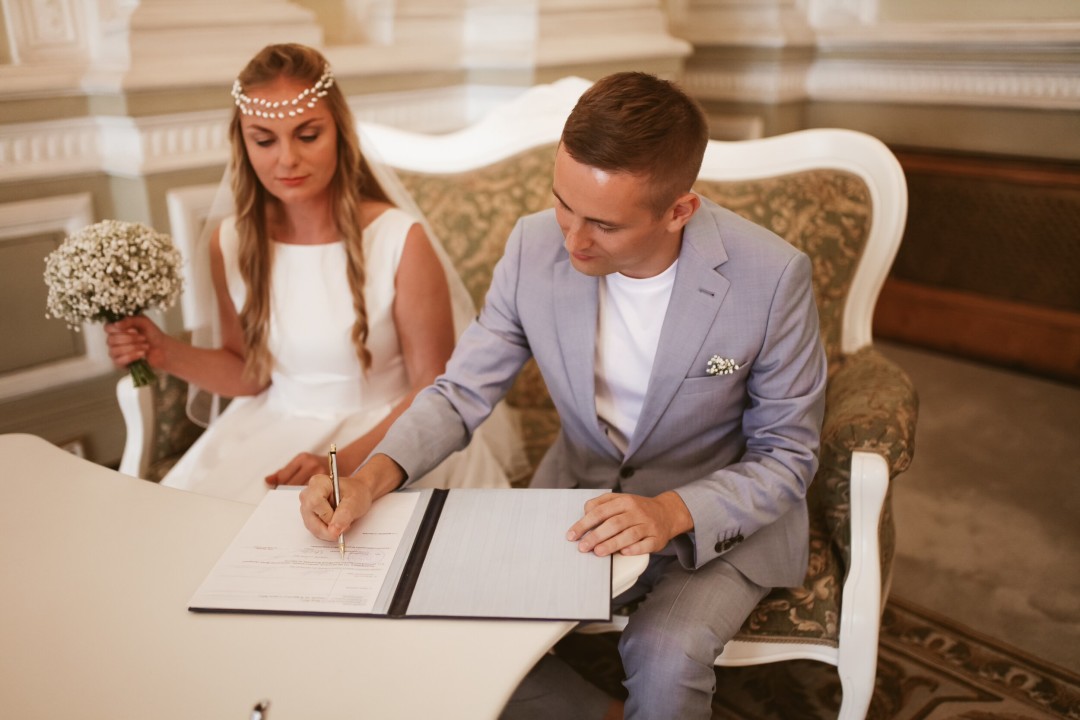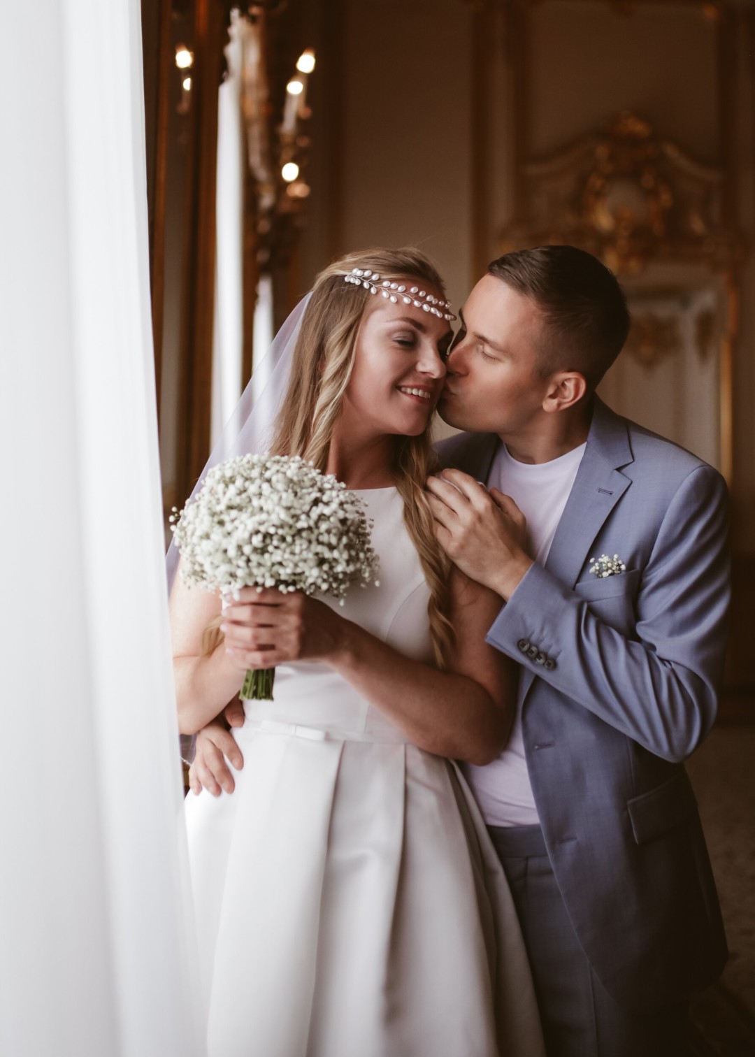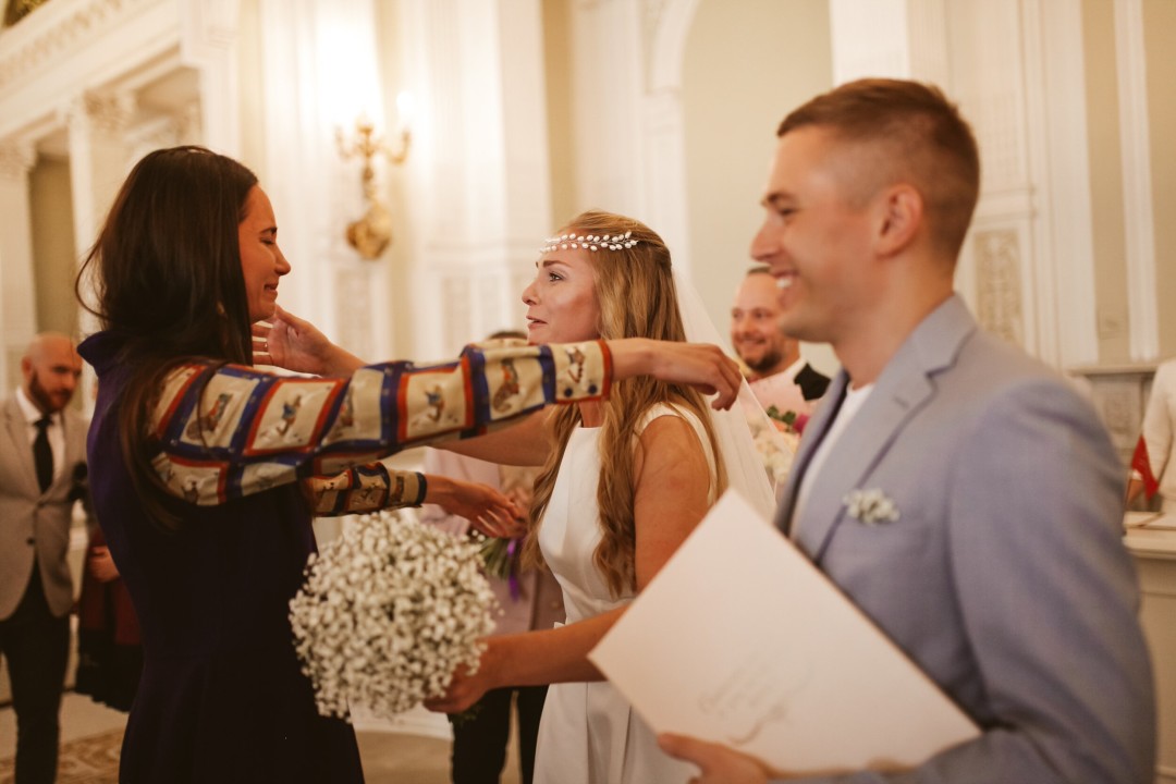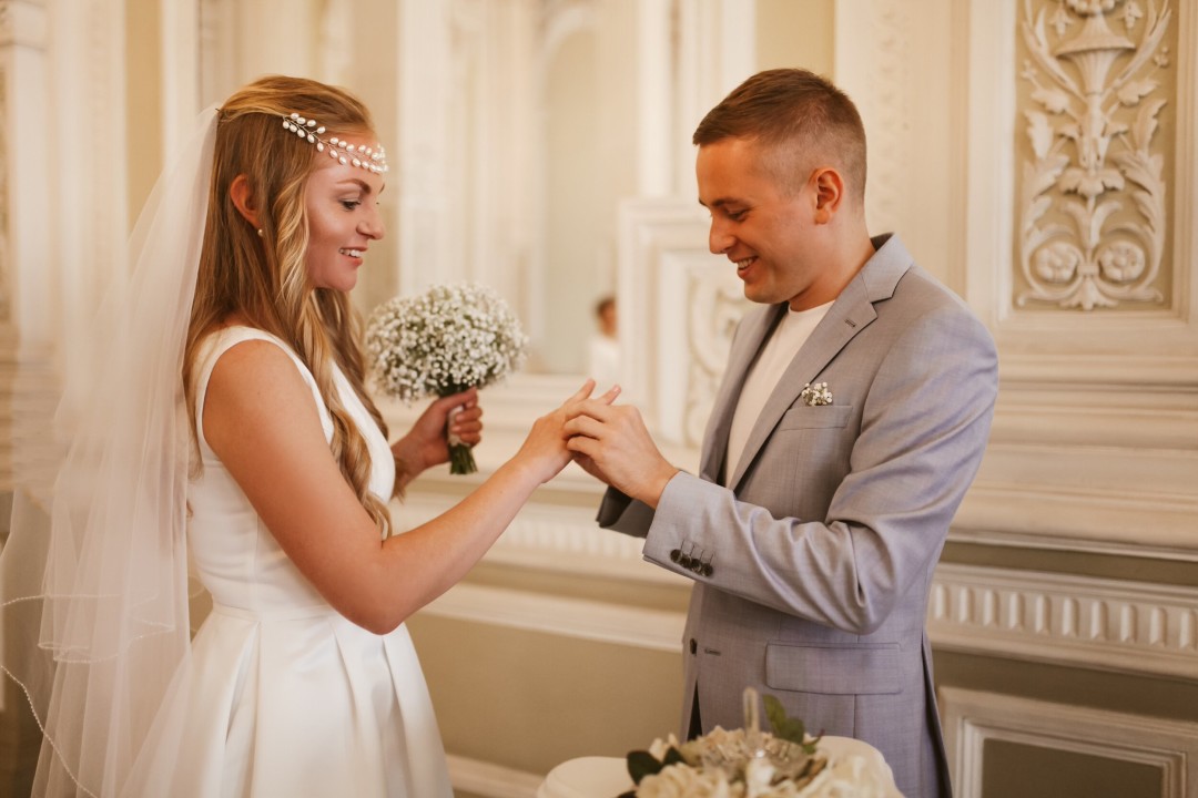 «Утро невесты» было решено провести в арендованных апартаментах. Ко мне приехала визажист и парикмахер — мама моей подруги Гали Головановой Ирина, а потом все близкие и сам жених. Когда мы с Артемом увиделись, он рассмотрел меня и спросил: «Ты что так сильно накрашена?». Потому, что в обычной жизни я так не крашусь. Это был один из самых забавных моментов нашего дня. Второй произошел в ЗАГСе, во время обмена кольцами. Еще на репетиции, когда молодоженам объясняют, кто кого первым поздравляет, кто куда поворачивается, под какую руку нужно держать невесту и так далее, кольца положили на блюдечко. Так как на нем находился конус, на который перед церемонией должны были повесить кольца, их со стороны Артема было не видно. Жених должен первым надевать невесте кольцо, а он смотрит на меня и говорит: «Аня, где кольца? Их нет, доставай скорее!» Это было очень смешно потому, что со своего-то ракурса я их видела! Весь спектр наших эмоций, собственно, отражен на фото.