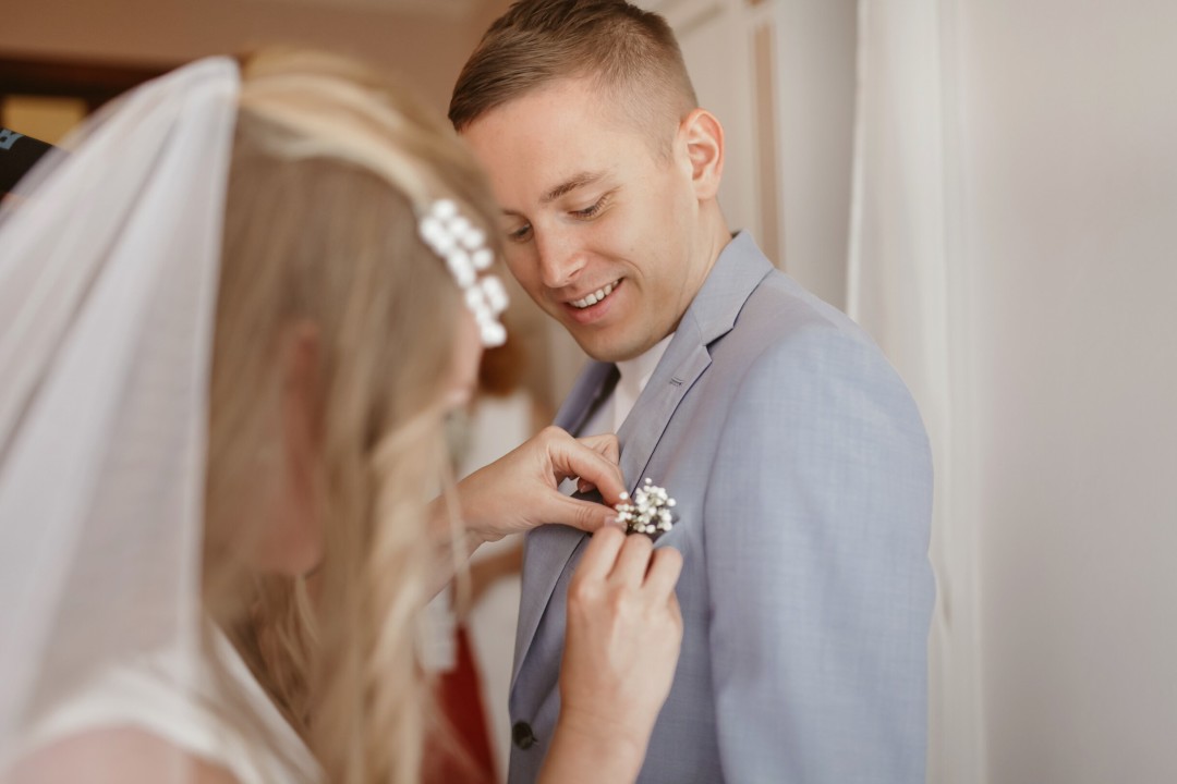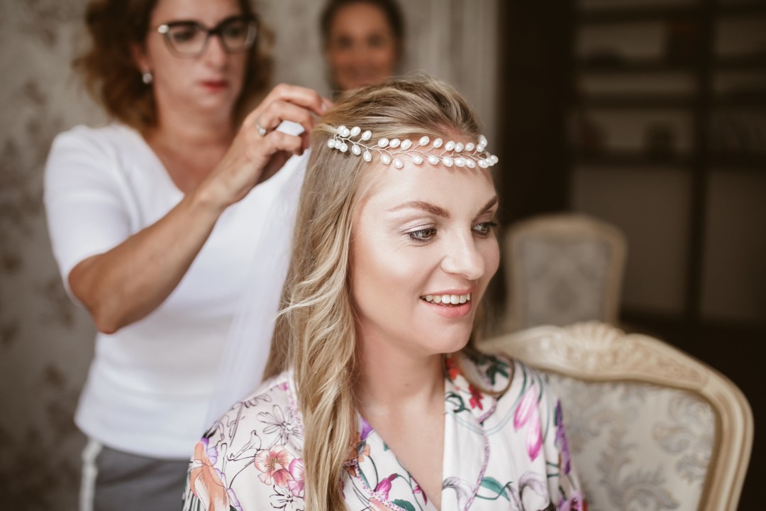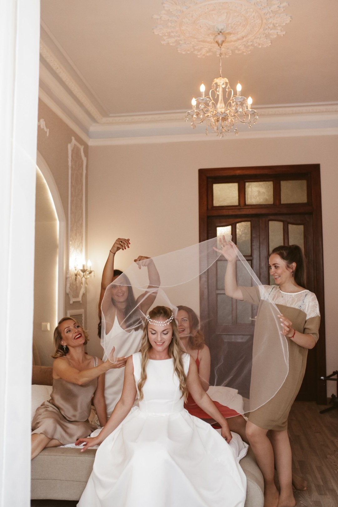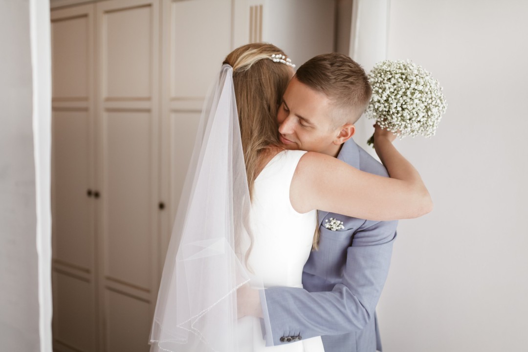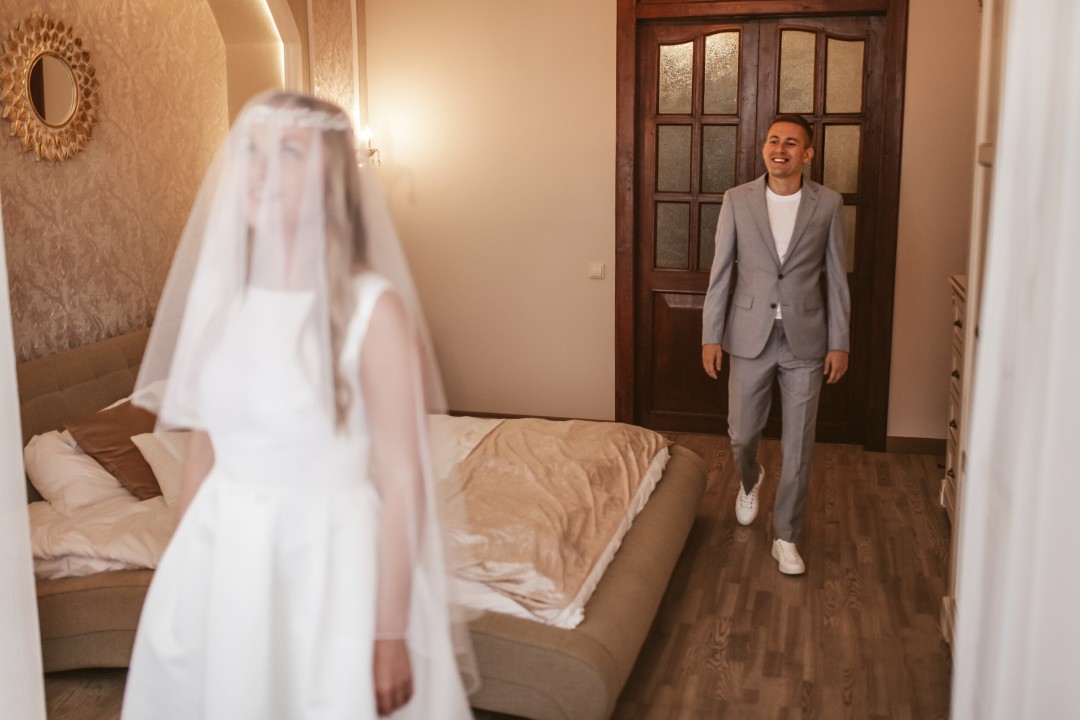 «Утро невесты» было решено провести в арендованных апартаментах. Ко мне приехала визажист и парикмахер — мама моей подруги Гали Головановой Ирина, а потом все близкие и сам жених. Когда мы с Артемом увиделись, он рассмотрел меня и спросил: «Ты что так сильно накрашена?». Потому, что в обычной жизни я так не крашусь. Это был один из самых забавных моментов нашего дня. Второй произошел в ЗАГСе, во время обмена кольцами. Еще на репетиции, когда молодоженам объясняют, кто кого первым поздравляет, кто куда поворачивается, под какую руку нужно держать невесту и так далее, кольца положили на блюдечко. Так как на нем находился конус, на который перед церемонией должны были повесить кольца, их со стороны Артема было не видно. Жених должен первым надевать невесте кольцо, а он смотрит на меня и говорит: «Аня, где кольца? Их нет, доставай скорее!» Это было очень смешно потому, что со своего-то ракурса я их видела! Весь спектр наших эмоций, собственно, отражен на фото.