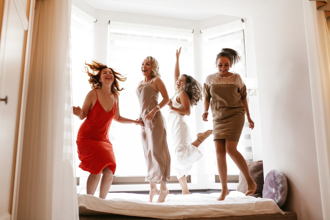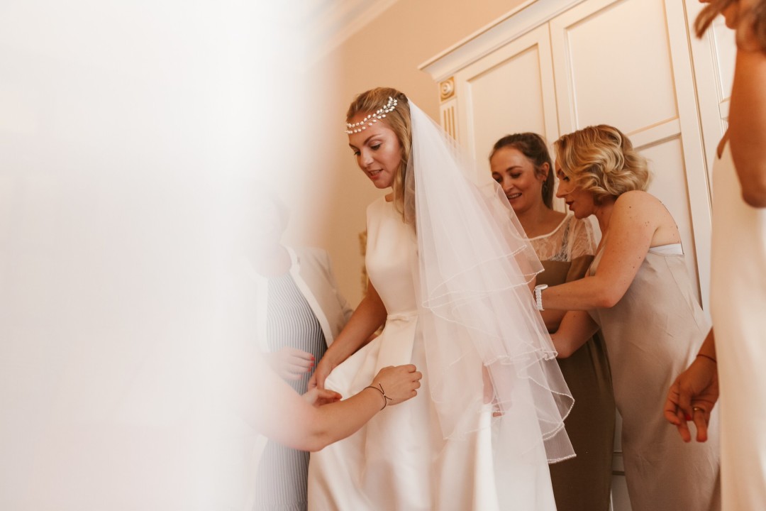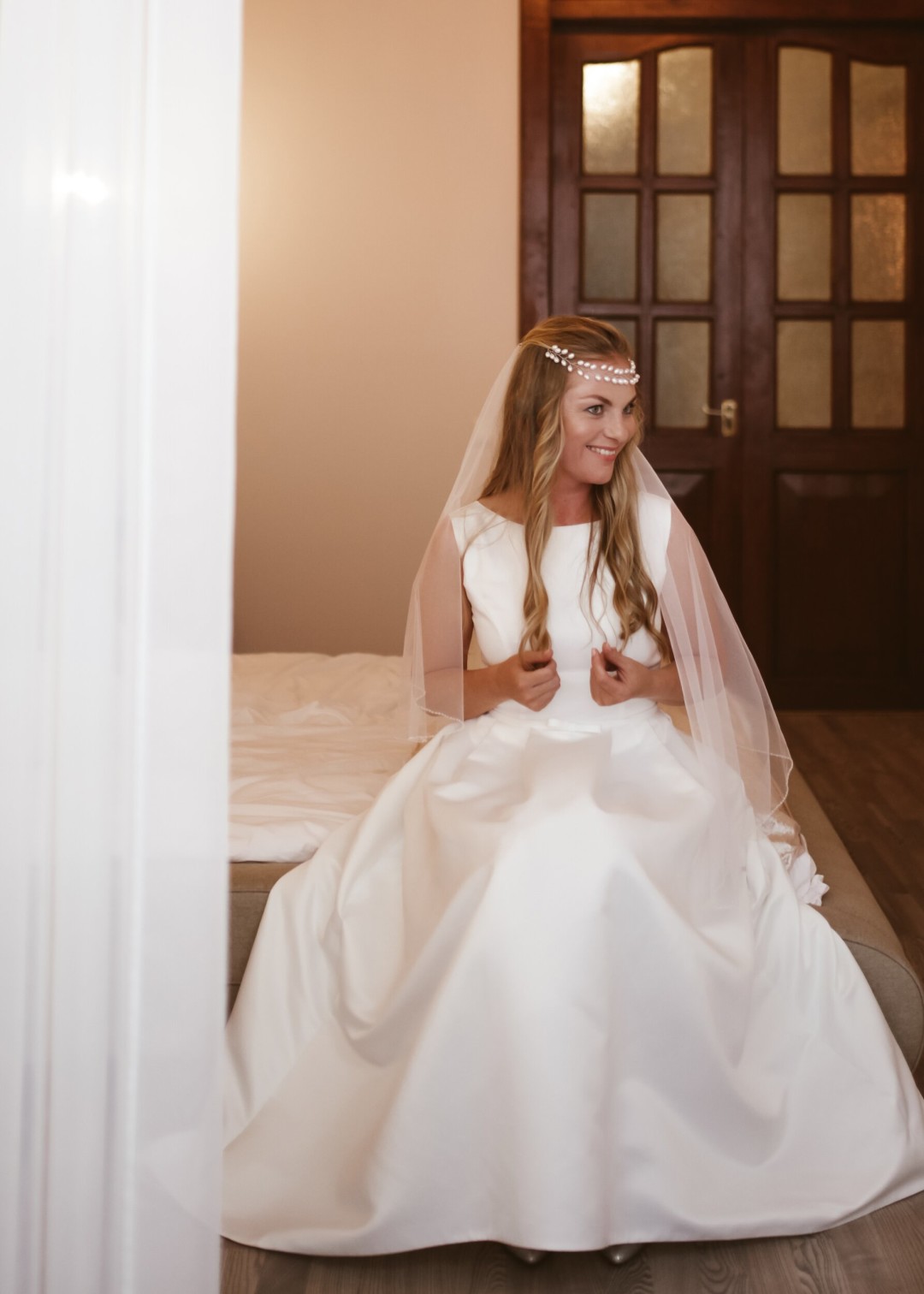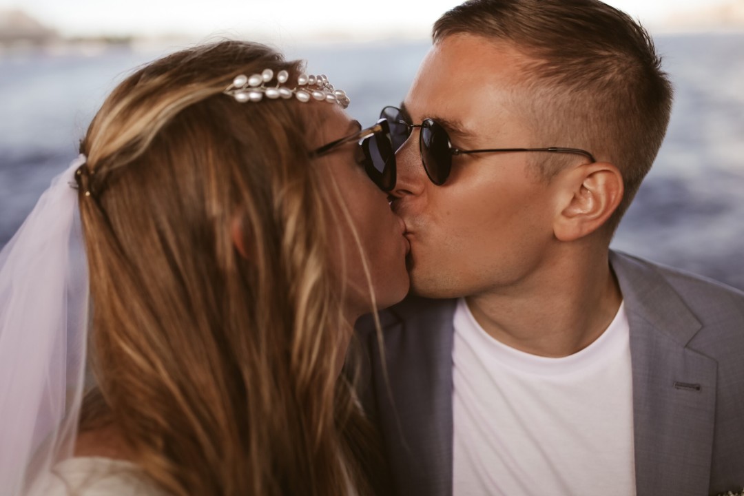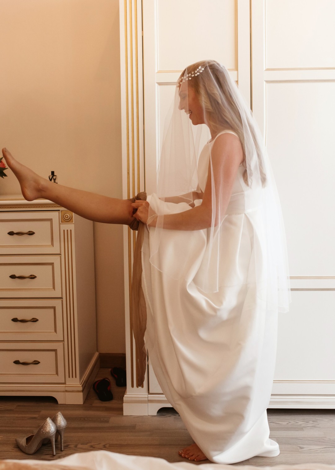 Первый поход в свадебный салон был случайным и даже трагичным. Все платья садились на меня, как на корову седло, — отвратительно! После этого я даже подумала, что не буду покупать свадебное платье, просто надену самое обычное белое. Но однажды зашла за вдохновением в Инстаграм и наткнулась на рекламу салона «Prazdnik». Несмотря на тривиальное название, в аккаунте было довольно много красивых платьев. И, что удивительно, на их примерку мне удалось записаться буквально в тот же день. Я провела в примерочной три часа, меня так хорошо обслужили, девочки были такими компетентными! В итоге мы отложили три платья, каждое из которых мне настолько нравилось, что пришлось отправлять их фотографии Артему для помощи в выборе. Остановились на самом удобном варианте с укороченным передом (чтобы танцевать на палубе) и карманами (чтобы складывать туда телефон). И это решение доказывает, что в процессе всей подготовки мы ориентировались лишь на свои ощущения, главным для нас оставался комфорт.