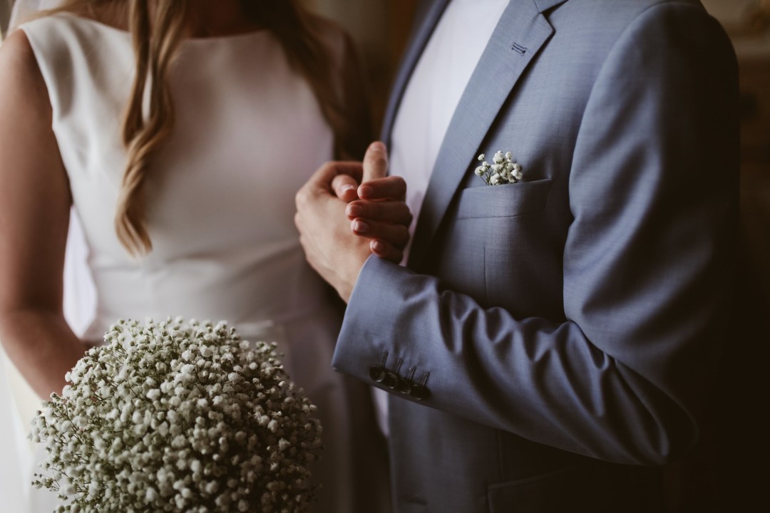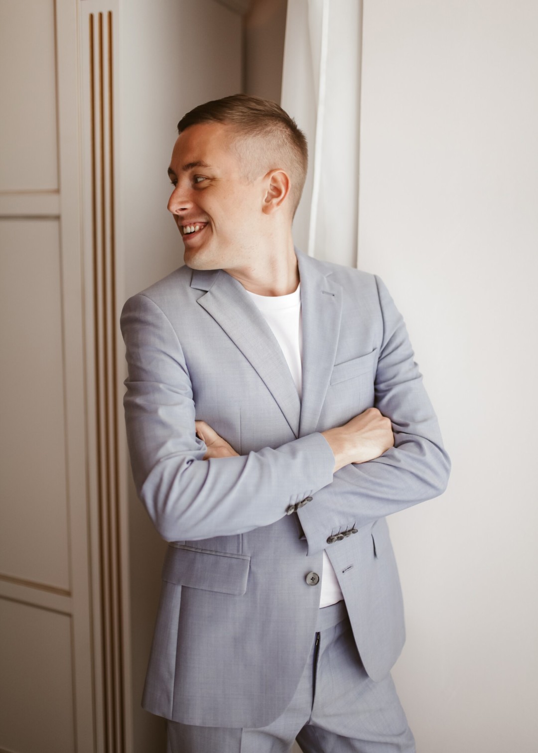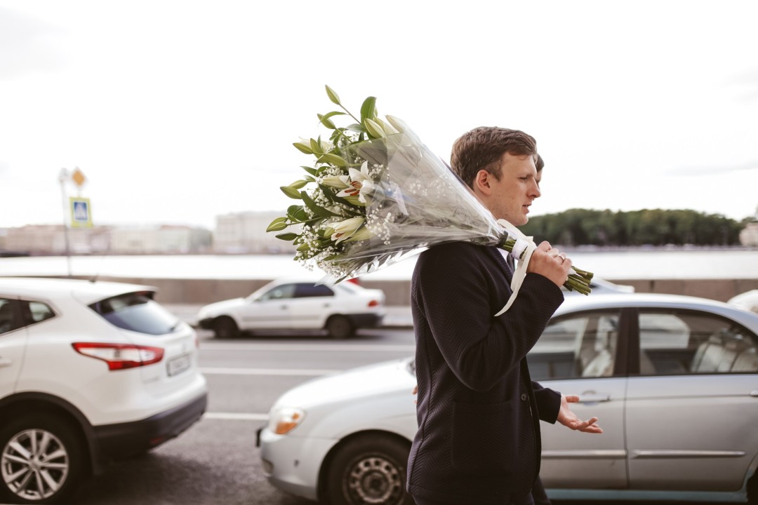 Моя знакомая Лиза Одиноких, которая праздновала свадьбу в прошлом году, посоветовала присмотреть костюм в коллекциях Cacharel. И была права: мы с Артемом купили подходящую модель в первый же день наших поисков! К нему выбрали футболку, а не рубашку, в которых Артем чувствует себя дискомфортно. Также он не носит украшения, поэтому покупка свадебного кольца обернулась для нас вопросом. Он хотел тонкую модель из белого золота, без всяких камешков и резьбы — классическое и минималистичное. У меня тоже было пожелание, чтобы кольцо было тонким и подходило к моему помолвочному с достаточно объемным центром. В итоге взяли неодинаковые модели в разных магазинах. Но обе нам очень нравятся!