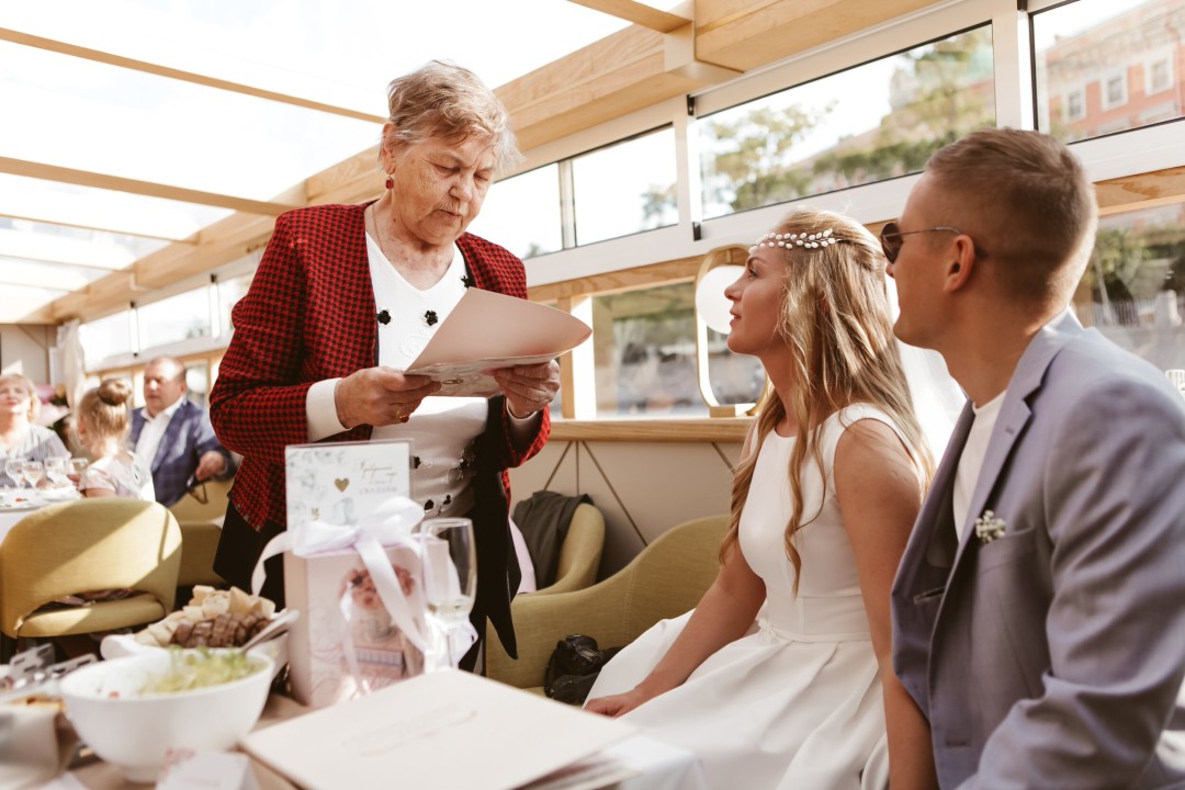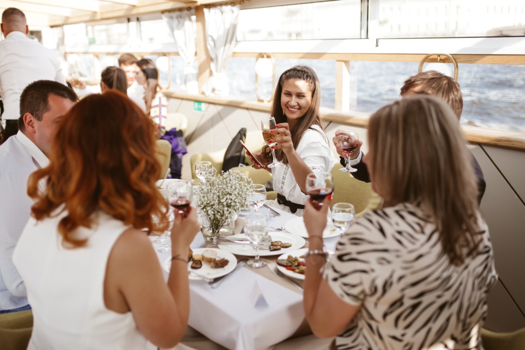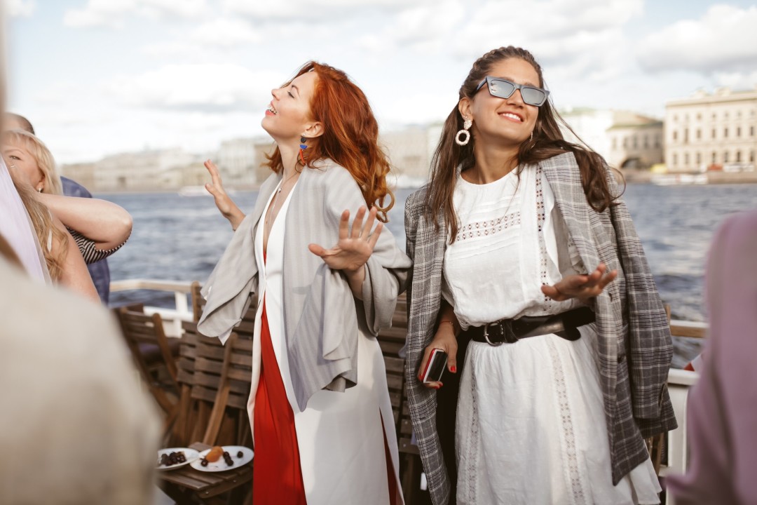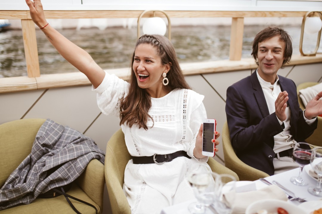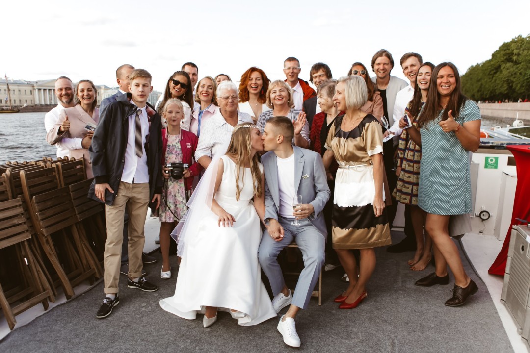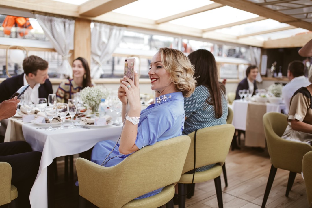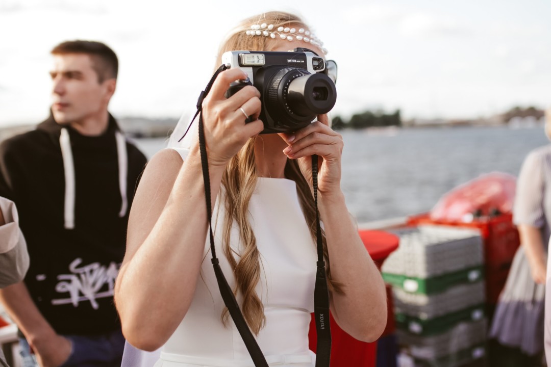 После ЗАГСа мы отправились на теплоход, который нам заранее помогли выбрать друзья из компании «Яхтенные сезоны». Мы сразу поняли, что не хотим проводить свадьбу в ресторане потому, что это статичная картинка: люди сидят за столами, едят, где-то на фоне играет музыка и звучат шутки ведущего. А на кораблике кругом интерактив: все вроде бы находятся в одном месте, но при этом всегда в разных локациях! Здесь не нужно связующее звено в виде тамады, конкурсов, бросания букета и подвязки. Мы вообще отказались от всех российских свадебных традиций: многие люди выполняют ритуалы слепо, не зная, откуда они и для чего на самом деле нужны. Единственная активность на нашей свадьбе — это фотосъемка на Polaroid для свадебного альбома, который я приобрела. Пожалуй, это мое единственное финансовое вложение в свадьбу — все остальное полностью обеспечил Артем.
