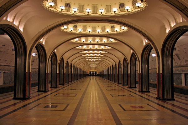 Кажется, по одной лишь прихоти неравнодушного к архитектуре наркома путей сообщения Лазаря Кагановича в СССР был сделан выбор в пользу метро-дворца, роскоши, а не средства передвижения. Послевоенные вестибюли сталинского метрополитена помпезны и вычурны, тогда как довоенные демонстрировали строгость и почти авангардную утонченность. Наглядный пример — «Маяковская», первая в мире колонная станция глубокого заложения.