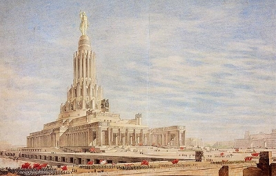 Грандиозное здание высотой 420 метров по проекту Бориса Иофана должно было стать апофеозом большого стиля. Многоярусный небоскреб с колоннами, увенчанный стометровой статуей Ленина — в два с лишним раза выше статуи Свободы, — начали строить на месте взорванного в 1931 году храма Христа Спасителя, успев сделать фундамент. В голове вождя предполагали обустроить библиотеку, кабинет Сталина или поставить зенитные установки. В войну проект заморозили, а затем было уже не до дворца, вместо одного гиперздания в Москве выросли «семь сестер» — семь высоток. После смерти кормчего культурный вектор был направлен не ввысь, а вглубь: фундамент Дворца Советов перетек в открытый бассейн «Москва».