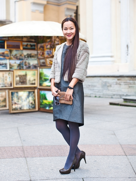 На Евгении: платье Ann Demeulemeester, шуба и очки JNBY, обувь неизвестной марки куплена на развалах, часы Rado, кольцо Piaget, клатч из кожи питона из Индонезии.