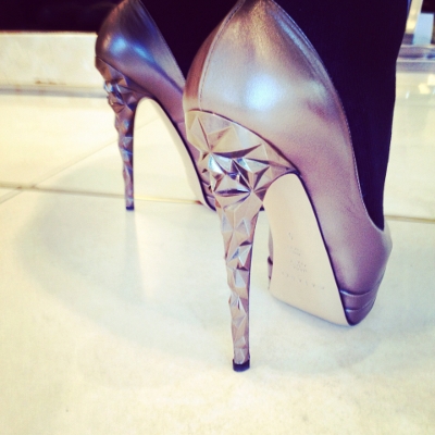 У туфель Casadei из серебристой кожи очень высокий каблук, поэтому не забудьте докупить к ним автомобиль с личным водителем.
