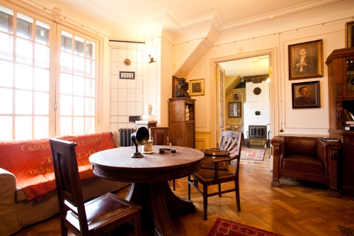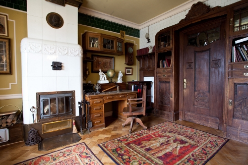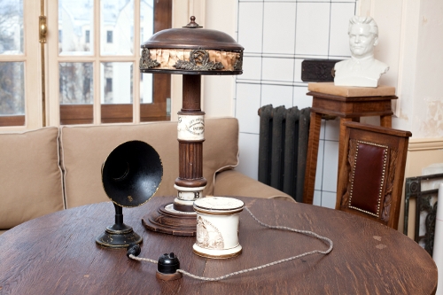 Гвоздь экспозиции — монументальный деревянный гарнитур «Хлеба коммунизма», созданный для меблировки дома-коммуны при Сельхозакадемии в Смоленске. В его декоре кремлевские звезды, серпы и молоты соединены со снопами ржи. Дома-коммуны, строившиеся в 1920-х годах, были призваны освободить человека новой эпохи от быта и даже порой от личных отношений. Например, архитектор Николай Кузьмин планировал в них общие спальни на шесть человек и «двуспальни», или «кабины для ночлега», где по особому расписанию уединялись супружеские пары. Однако увлечение авангардным способом общежития быстро сошло на нет, и уже в 1930 году ЦК ВКП(б) назвал такие дома «вредным утопическим начинанием». Роскошный комплект был выкинут, и Сергей нашел его чуть ли не в курятнике. Удачно сочетается с гарнитуром деревянный радиостол — ноу-хау 1930-х годов. В сложенном виде он ничем не отличается от обычной столовой мебели, однако если его раздвинуть, обнаружится радиоточка «для индивидуального и группового прослушивания» — либо в наушниках, либо через динамик, роль которого выполняет керамическая чаша. Автор этого стола — скульптор Игорь Крестовский, известный реставрацией скульптур на главных городских фасадах, от Эрмитажа до Адмиралтейства, и переработкой картушей дореволюционных зданий в соответствии с советской символикой. Резной вход в библиотеку раньше украшал кабинет Исаака Зальцмана, легендарного директора Кировского завода, народного комиссара танковой промышленности СССР, в одночасье потеряв-шего все в 1949 году из-за того, что отказался давать показания против фигуран-тов «Ленинградского дела». От смерти его спасло только личное вмешательтво Сталина, который помнил военные заслуги Зальцмана. Массивные кожаные кресла и диван в холле тоже могли бы сойти за часть меблировки кабинета видного советского чиновника, но на самом деле их история более давняя: они стояли в Таврическом дворце, на них заседали члены первой российской Государственной думы, а после революции, будучи практически новыми — им даже не потребовалась реставрация, они были списаны. Большую часть проходной комнаты занимает трофейный стол из дома маршала Ивана Баграмяна — и это в сложенном виде, а если его раздвинуть, то за ним уместится не один десяток гостей.