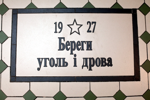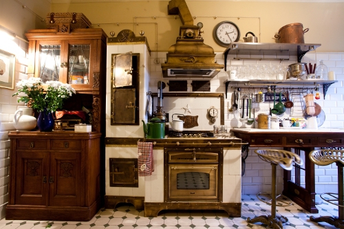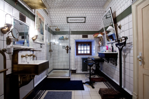 Пространство детской не перегружено советской атрибутикой: у дочери Сергея она теплых чувств не вызывает. Кубок в серванте — подарок советского правительства Фиделю Кастро, но особой идеологической нагрузки в интерьер он, к счастью, не вносит. Миниатюрные кресла и столик — детская мебель из княжеского дворца. Большая коробка с диафильмами не просто элемент обстановки: их извлекают и просматривают каждый Новый год, когда Сергей устраивает для детей друзей советскую «идеологическую» елку, с Дедом Морозом и чтением стихов. Поскольку большинство гостей приезжают на праздник из-за границы, страноведческий аспект для них не менее увлекателен, чем исторический. Хозяйская спальня объединена с кабинетом, где стоит бюро, прежде находившееся в помещении радиостанции в Новой Голландии. Обустройство здесь еще не окончено, предстоит подвесить и подключить телефон. На кухне уже укреплен металлический дисковый военный аппарат –вполне рабочий, с прекрасным качеством звука. Холодильник, хотя и покрашен масляной краской и декорирован пятиконечной звездой, на самом деле современный, как и посудомоечная машина, скрывающаяся за дверцей из листового железа. Но есть в квартире и вековой холодильник, он представляет собой небольшой шкафчик с двумя отсеками: в один помещались продукты, в другой закладывался лед, который можно было купить в льдохранилище в этом же доме, а через кран сливали талую воду. Рядом с плитой стоит самовар, можно кипятить воду на шишках — получается даже быстрее, чем в чайнике. Приятно пить чай, покручиваясь на табурете, сделанном из тракторного сиденья. Парные буфеты из рабочей молочной столовой скрывают соответствующую кухонную утварь: например, столовые приборы с надписями «Дети — наше будущее» и «Тридцатилетие Октября». Даже такие прозаические места, как уборные (их две — мужская «помывочная» и женская), украшены плакатами, лозунгами и аутентичной сантехникой литейно-механического завода Сан-Галли — промышленного гиганта, помимо выпуска предметов домашнего обихода выполнявшего и крупные государственные заказы. В частности, здесь отливались детали Троицкого моста и железные конструкции для дома Зингера. Количество раритетов на квадратный метр в этом доме огромно, на каждом шагу можно найти что-то уникальное: двенадцать фигур Сталина для его музейного комплекса в Гори, копии скульптур со станции метро «Площадь Восстания», сервиз для гостиницы «Космос» на ВДНХ, личное знамя Махно и знамя больницы Скворцова-Степанова, бюст Кирова, сделанный на ЛФЗ, бурка начальника штаба Красной армии и реглан начальника эвакуационного отдела Ленинграда, портреты маршалов и героев фронта, эскиз проекта здания МИДа без башни. Сергей говорит, что на кого-то такая насыщенность давит, а он чувствует себя здесь как рыба в воде, но при этом признается, что, несмотря на любовь к советскому антуражу, теплых чувств ни к режиму, ни к его лидерам не испытывает.