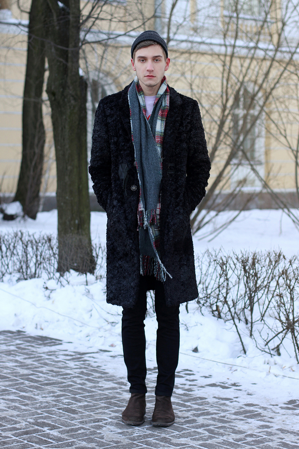 Пальто Leonid Alexeev, футболка Meadham Kirchhoff, рубашка H&M, джинсы Dr. Denim, ботинки Common Projects