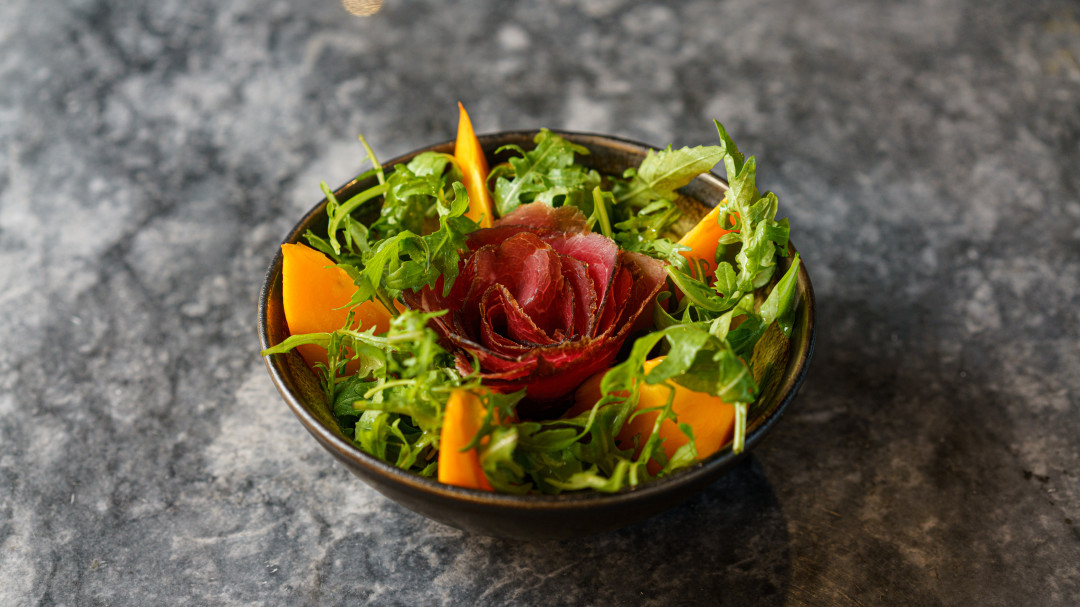 Домашняя брезаола с хурмой, страчателлой и рукколой