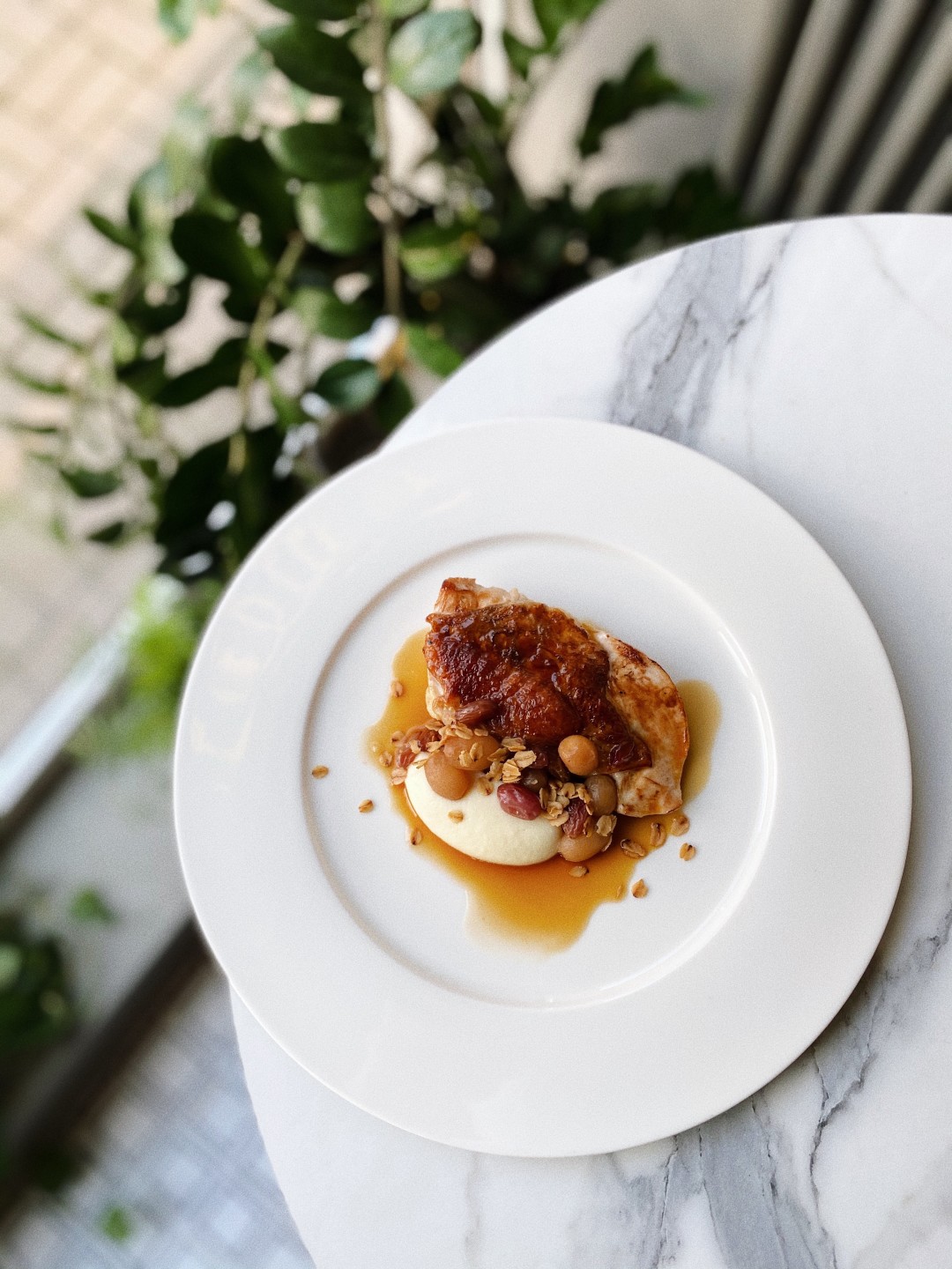 Гребешок с хурмой и мандарином и цесарка c пюре из пастернака