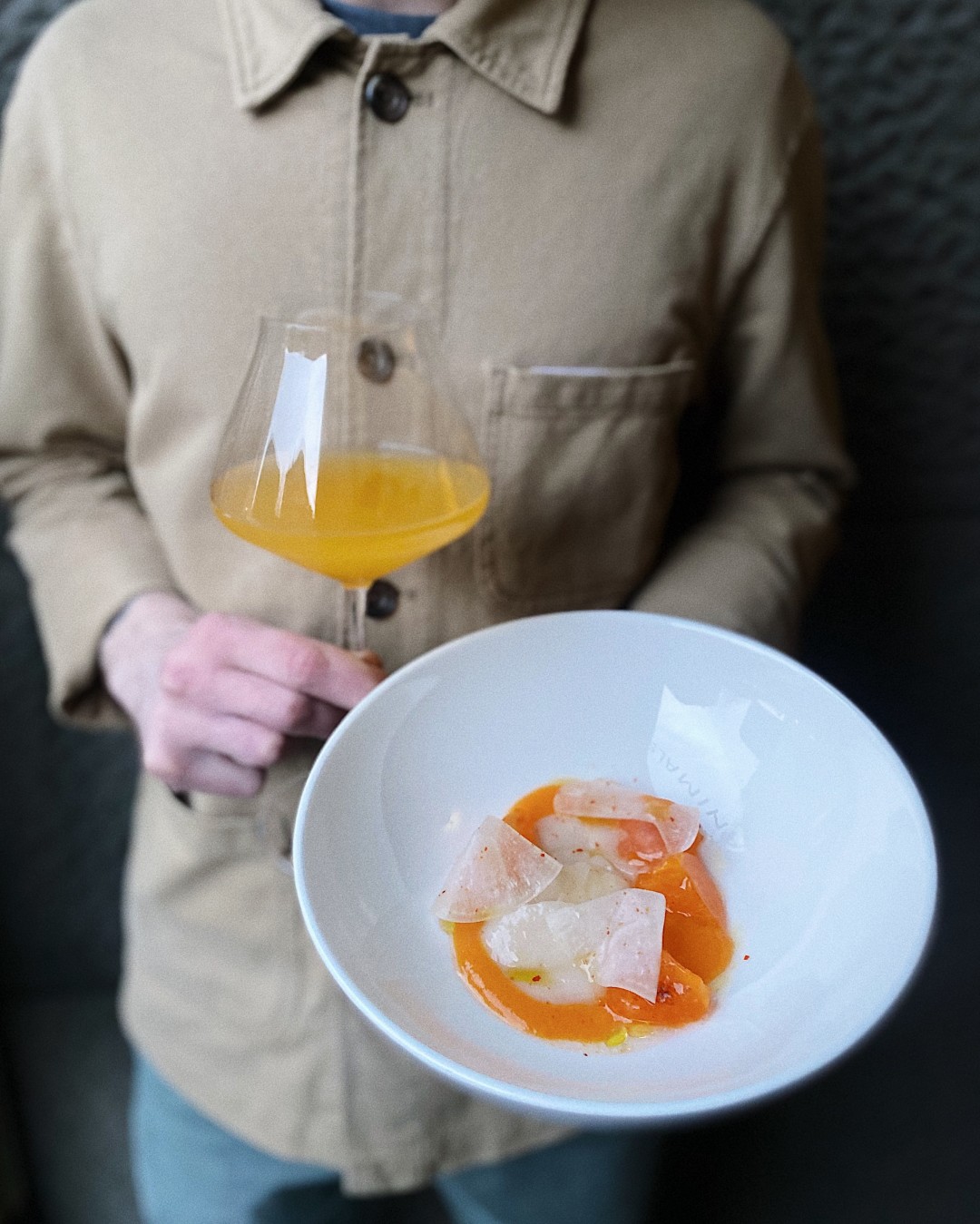 Игорь Гришечкин в Cococo Bistro специализирует всю кухню на сезонных продуктах. Этой зимой мы голосуем за брезаолу — альтернативу итальянской парме с дыней: тонко нарезанная сыровяленая говядина, которую готовят прямо в бистро, сливочная страчателла, хурма, пряная лимонная заправка и свежемолотый перец.