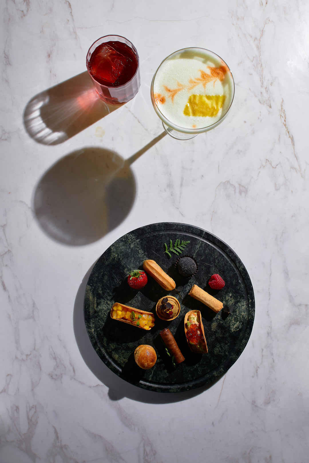 14 февраля в мясном ресторане заказываем сет миниатюр. Для каждого в паре блюда свои — кому-то ржаная трубочка с тартаром из оленины, бриошь с пастрами, ржаной мадлен с мраморной говядиной и куриный паштет с луковым джемом, а кому-то гребешок с манго, эклер с крабом, тартар из форели и «ложный» трюфель. Коктейли для субъектов тоже разные — твист на негрони и коктейль с нотами спелой японской дыни и цедрой лайма.