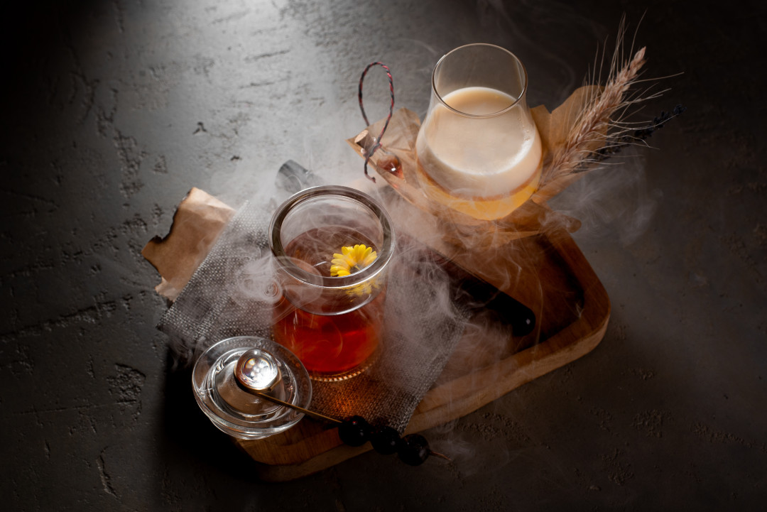 Сет блюд состоит из трех курсов: севиче из креветки с помело в маринованной кольраби, филе утки с копченой вишней и пирожным «картошка» из сельдерея, кокосовый тирамису с личи. Илья Бунин подготовил коктейльный сет, в котором все дело в подаче — вливать порто, опрыскивать хвойной водой, приправлять биттером, распаковывать крафтовый мешок с запиской — все это мы очень любим.