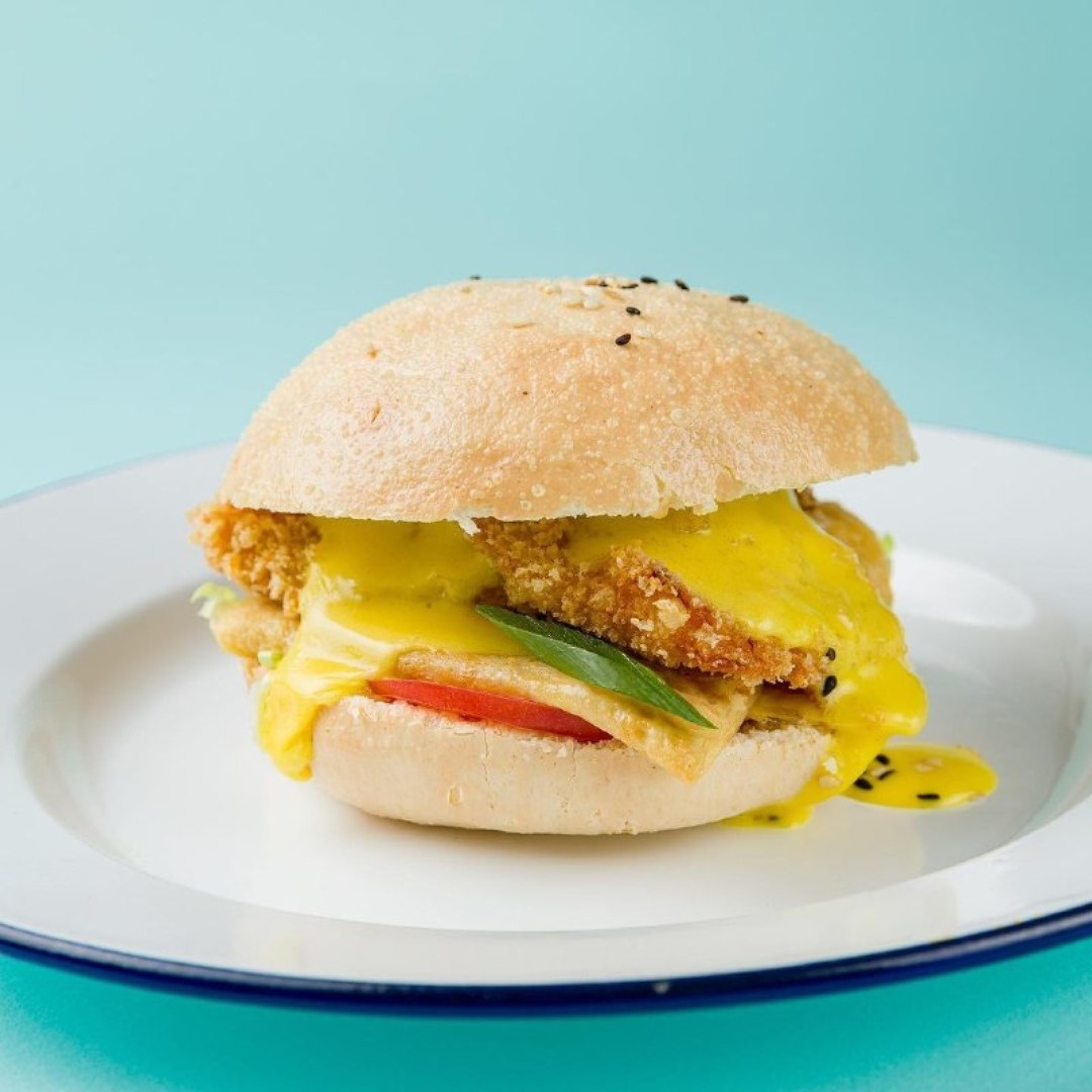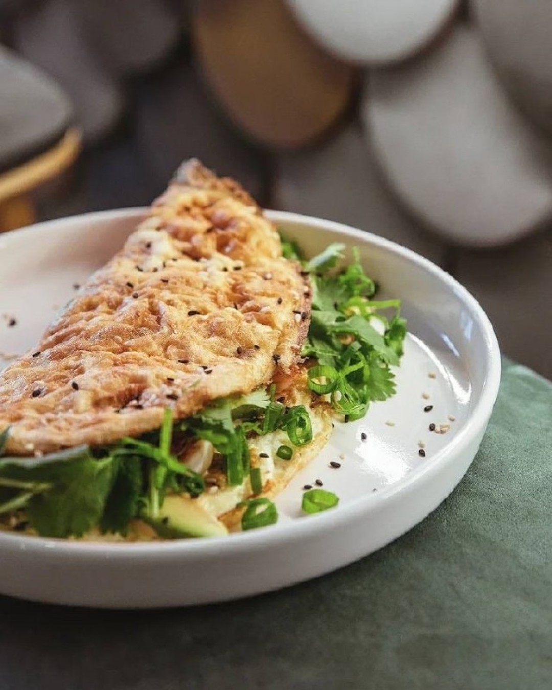 На утренний бургер с цыпленком, японским омлетом и соусом голландез или панкейки с голубой матчей и маракуйей приходим по будням с 11 до 13. А выходные целый день проводим с омлетом на кокосовом (!) молоке с тигровыми креветками и кальмаром.