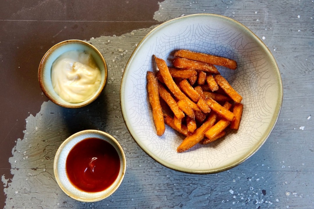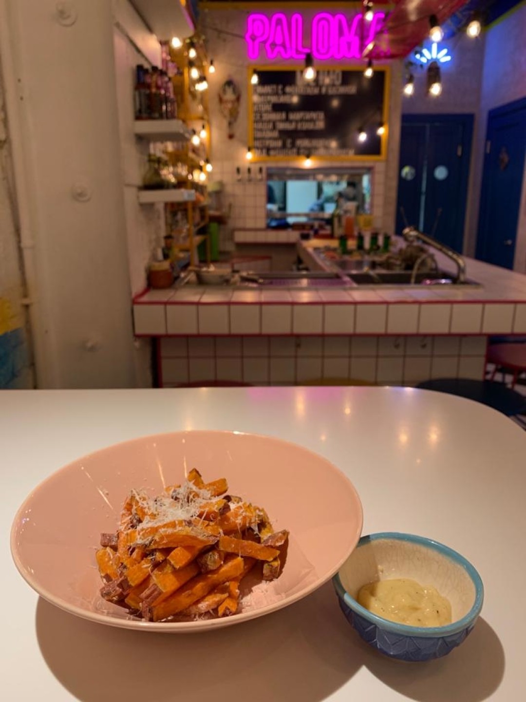 Когнитивная память не дремлет: говоришь «картофель», тут же приставляешь «фри». Думаем, поэтому шеф Антонио Фреза решил не изобретать велосипед и подает сладкую картошку стартом: хрустящая соломка яркого цвета охры с дуэтом домашних соусов — айоли и томатным.
