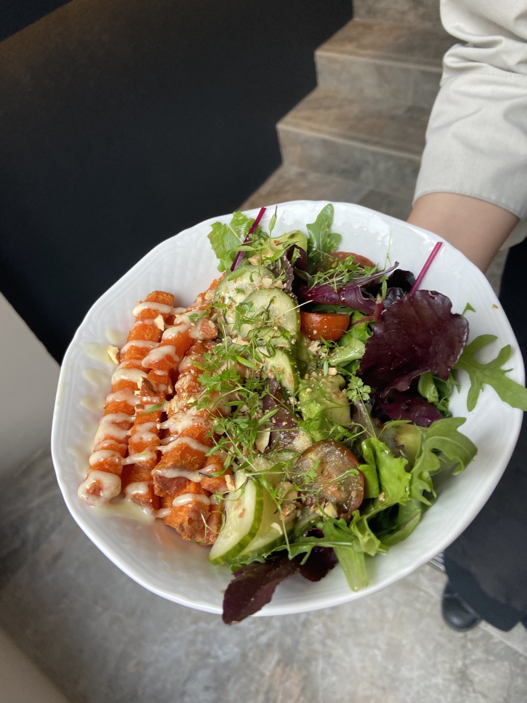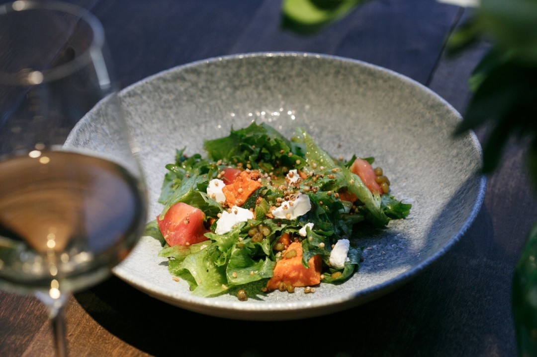 В новом бистро на Некрасова воспевают ненавязчивую французскую кухню и к легкому вину преподносят салат с огурцами, маринованными имбирем и чесноком, зеленым миксом и бататом фри под лаймовым айоли. Порция весомая, но и торопиться не нужно!