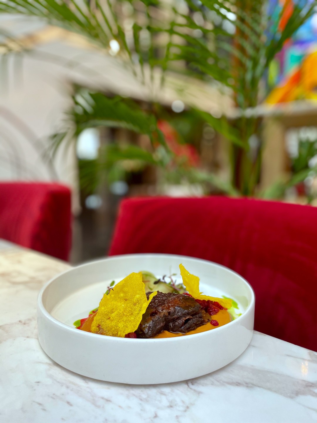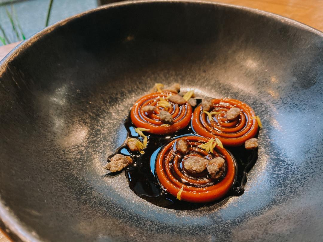 Мясники из ресторана «Блок» не оставляют шанса ни одной части животного и творят с ними шедевральные сочетания. Телячьи щеки предварительно коптятся на ольховой стружке, а потом еще бегут 5-ти часовой марафон для нежной текстуры. Подаются вместе с кремом из печеного батата и брусники.