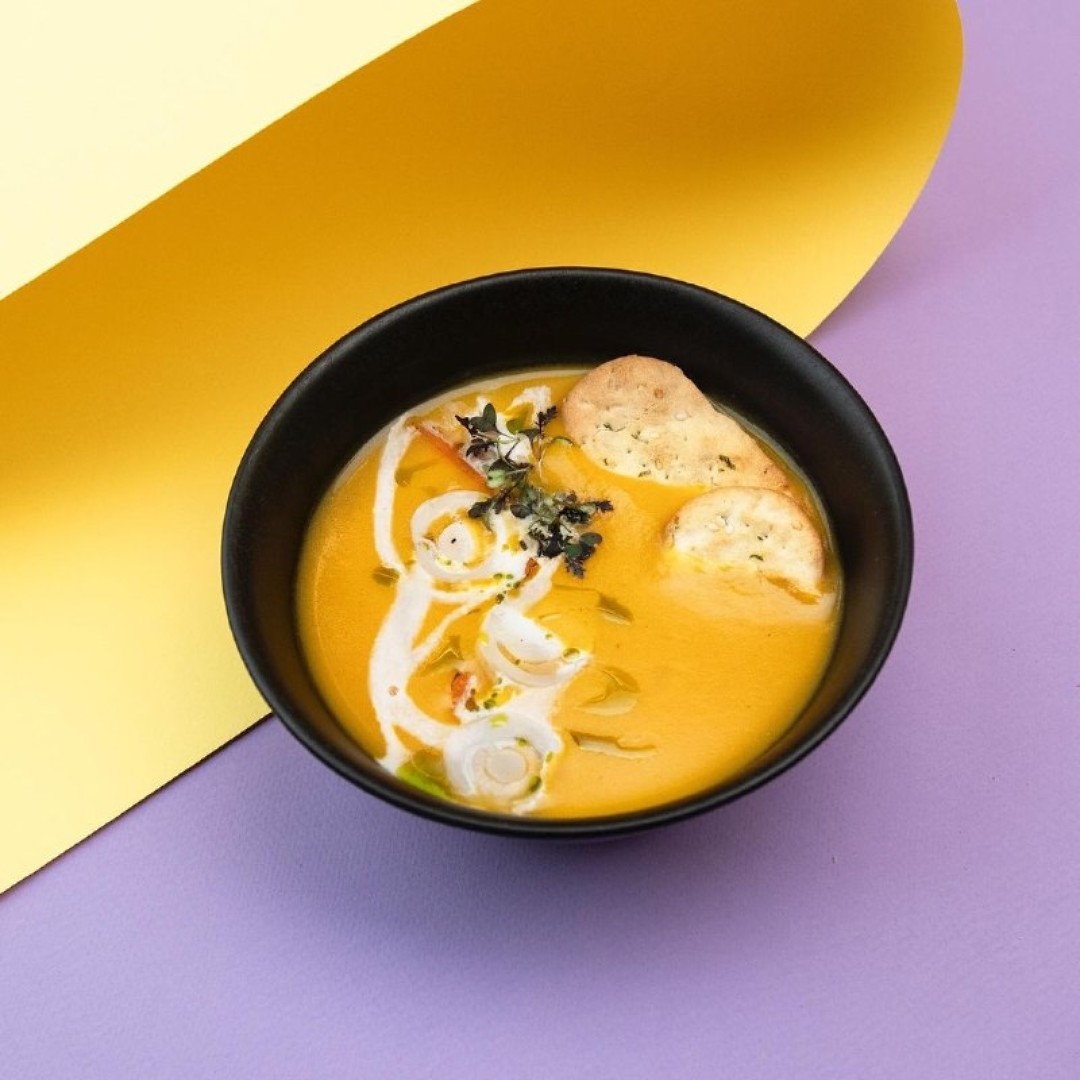 Лайфхак по сублимации дефицитного солнца в Петербурге (да, даже летом!): на Жуковского в Bao Mochi заказываем яркий крем-суп из батата и мягкой спелой тыквы с кокосовым молоком и соломенными грибами цао гу!