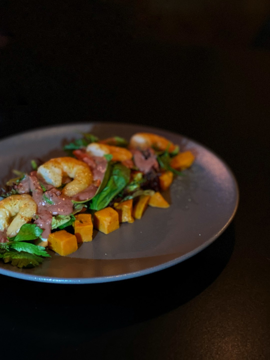 Полнотелый салат на основе запеченного батата (поговаривают, самого сладкого в городе) с крупными креветками, сливочным крем-сыром и зеленью. Вся харизматичность блюда скрывается в соусе из красного лука и маракуйи.