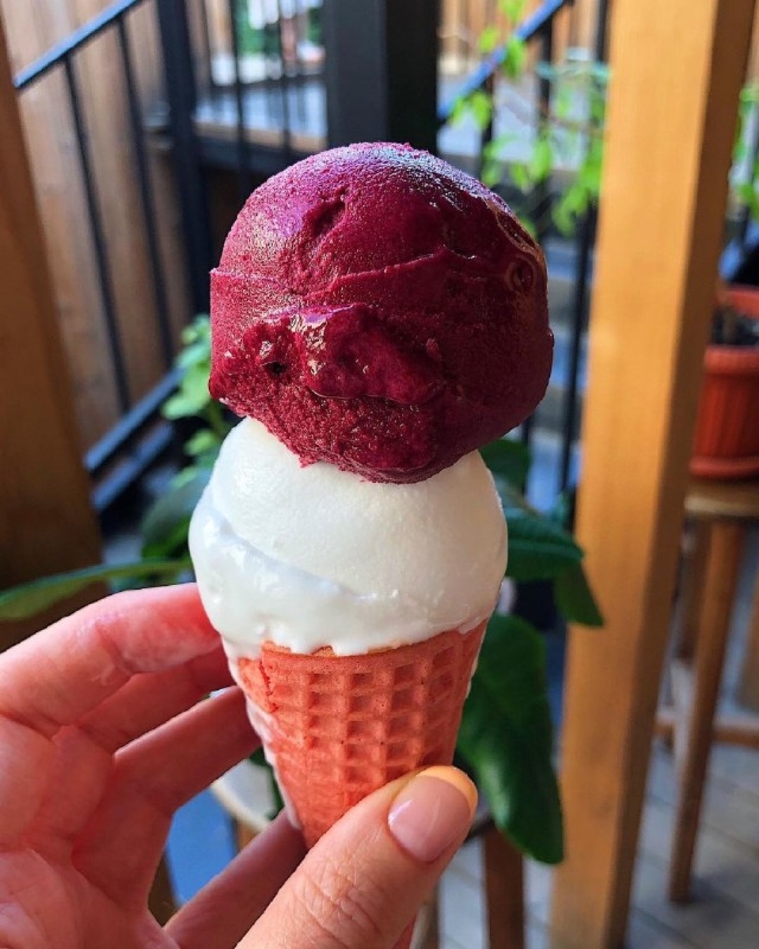 Растительный вайб раздают даже мороженым, которое производят сами из кокосового и кешью молока, а подслащивают концентрированным виноградным соком. Принять решение, что пробовать — непросто! Вариантов всего 5: ваниль, шоколад, вишня, манго и сырное.